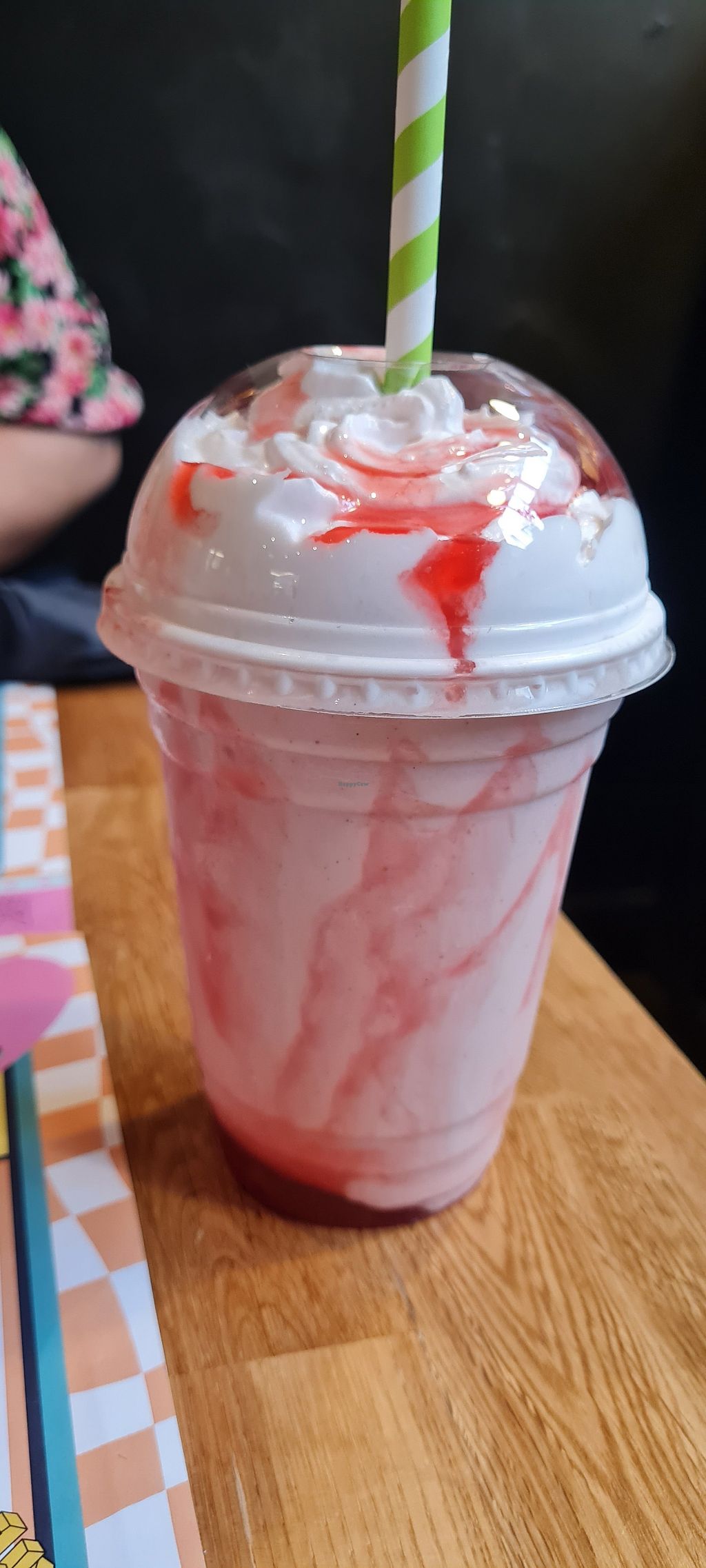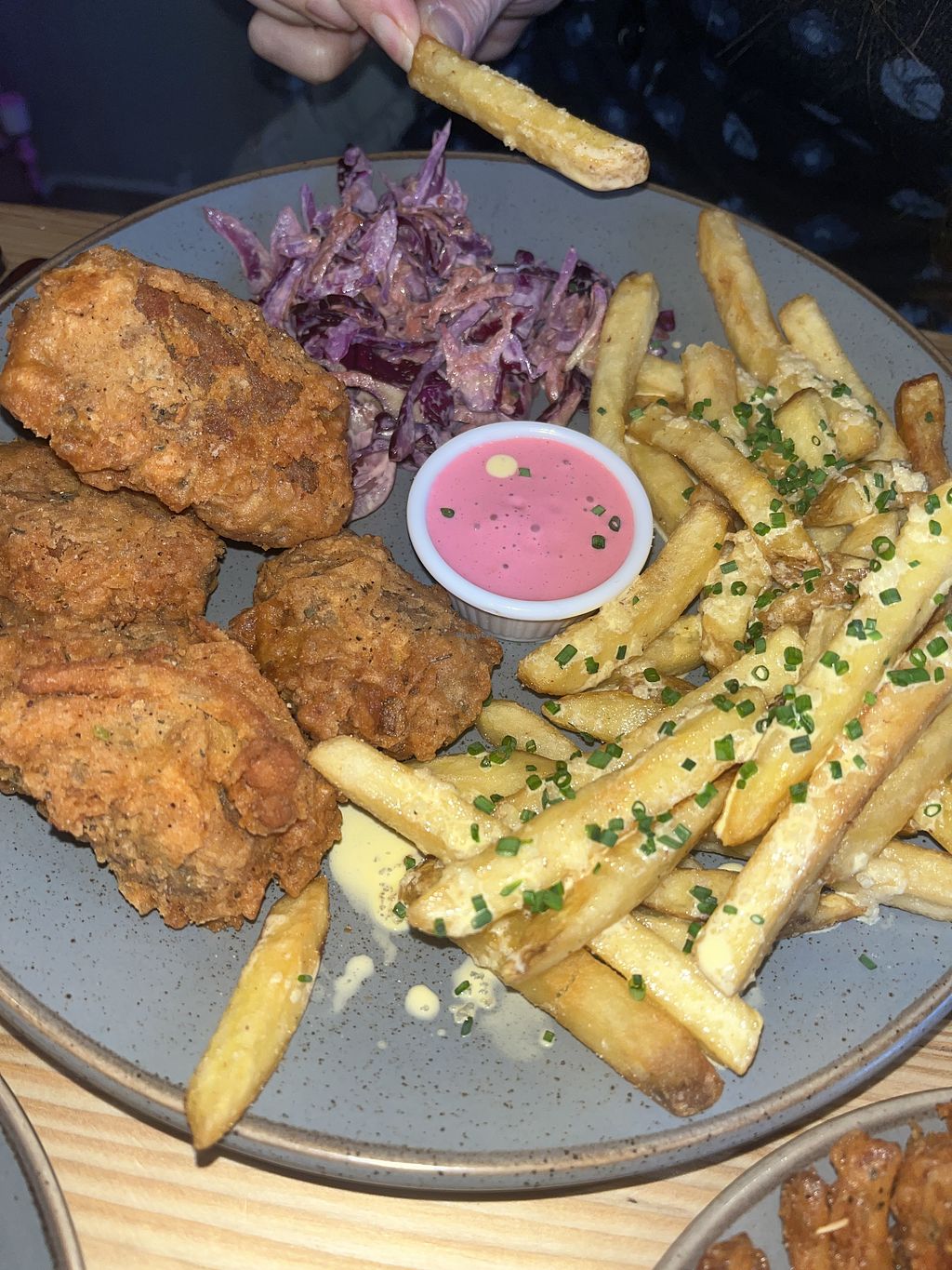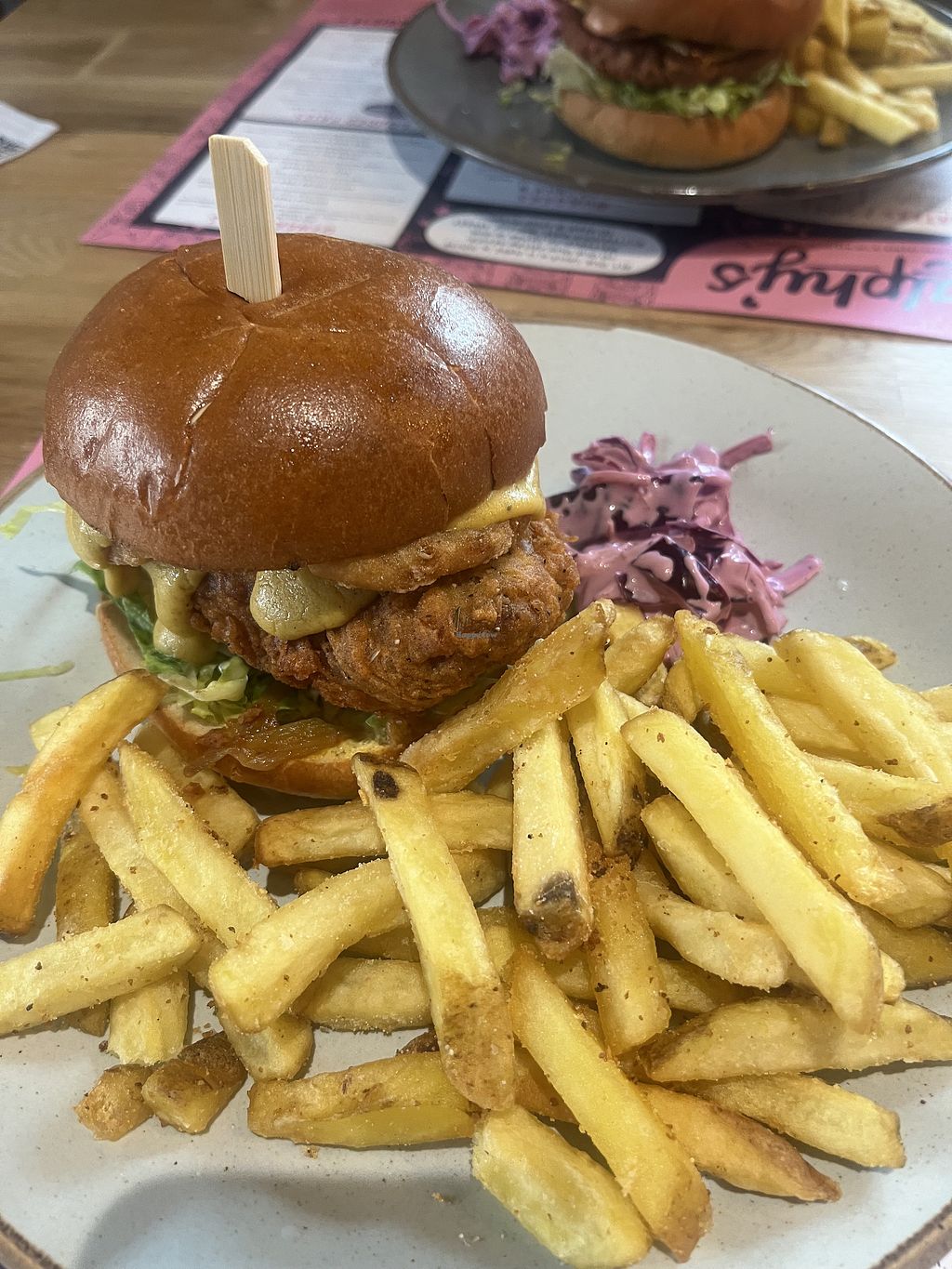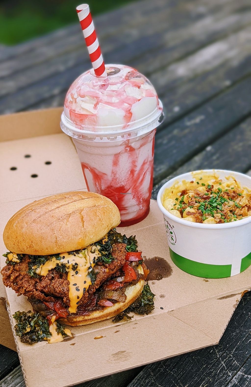 Cheese fries, sauce, slaw, chicken sandwich and shake