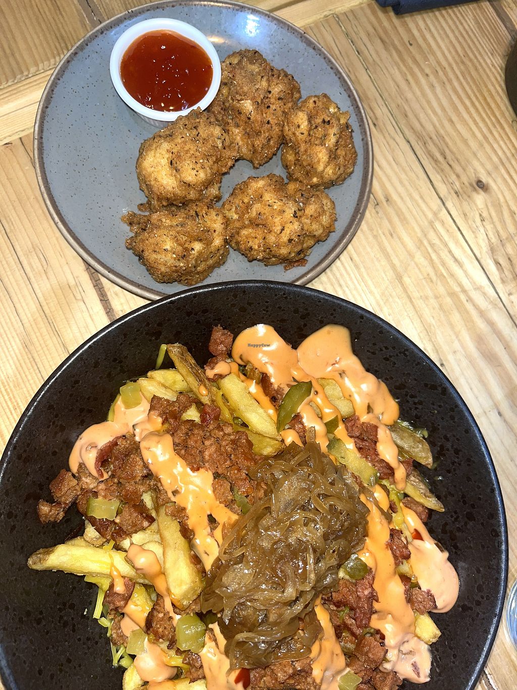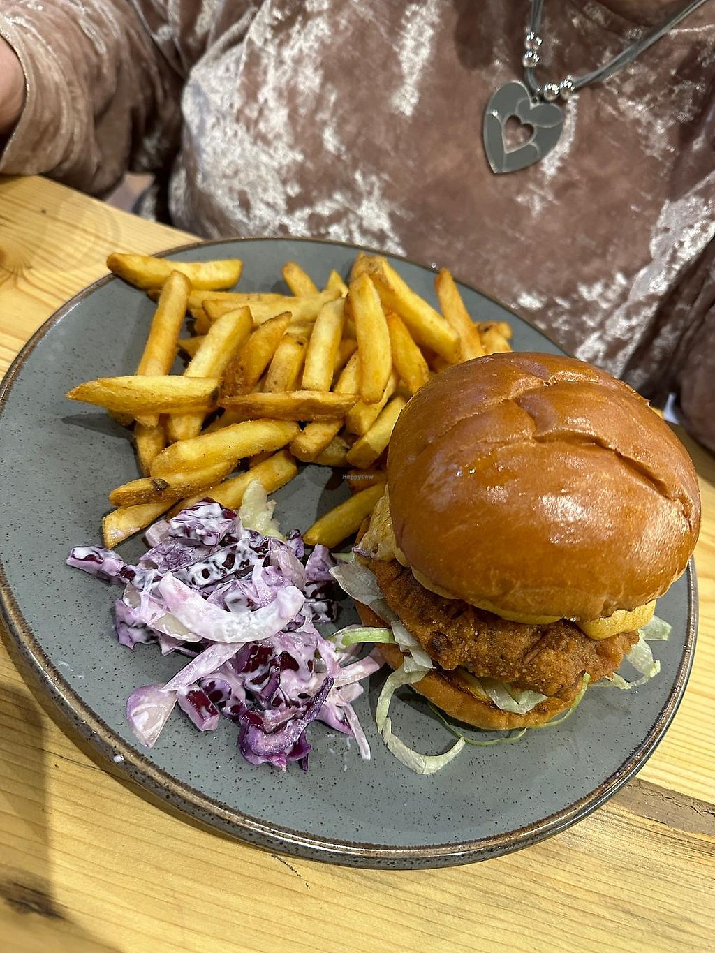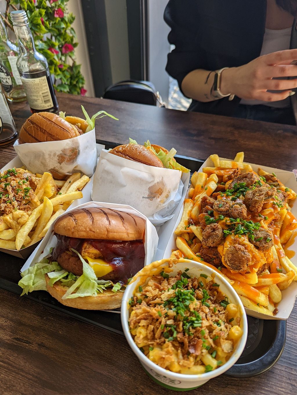 Cheese fries, sauce, slaw, chicken sandwich and shake