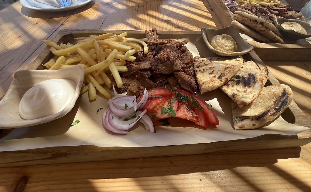 Serves meat, vegan options available. Beach bar & restaurant. Has several dishes and drinks that are clearly marked as vegan. One of them is vegan gyros. Open Mon-Sun 9:00am-6:00pm.
