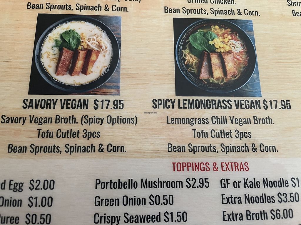 Serves meat, vegan options available. Izakaya with two vegan ramen options, vegan mochi ice cream, and some vegan drinks and apps. , vegan lemongrass ramen, savory ramen, mochi ice cream, edamame, Thai iced tea, crispy avocado rice, tofu nuggets