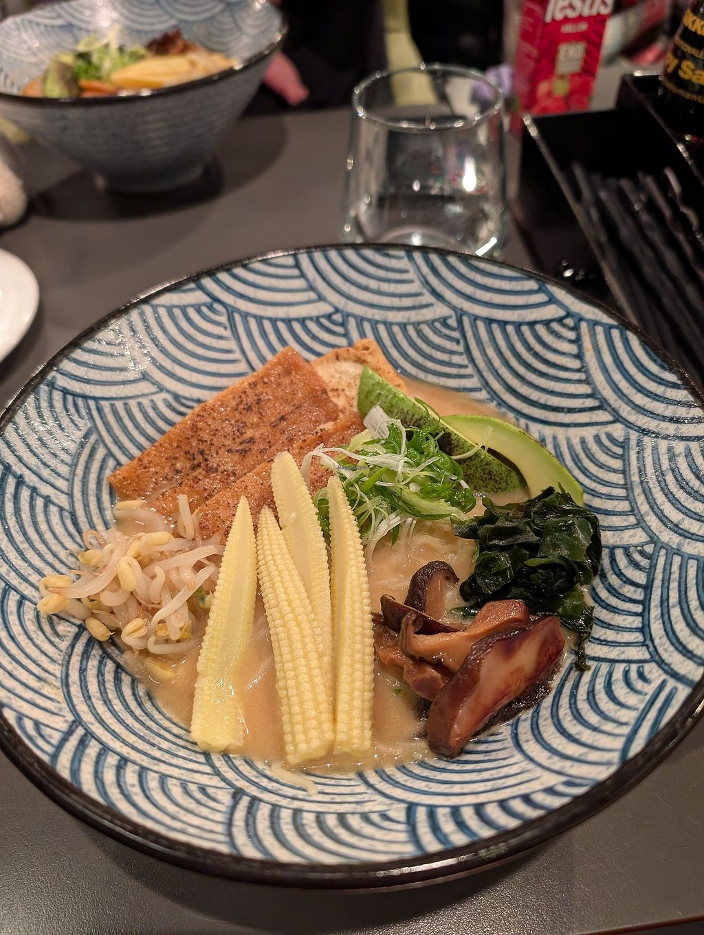 Vegan ramen: Creamy Beet Miso Broth, Seaweed Base, Wakame, Tofu, Shii…