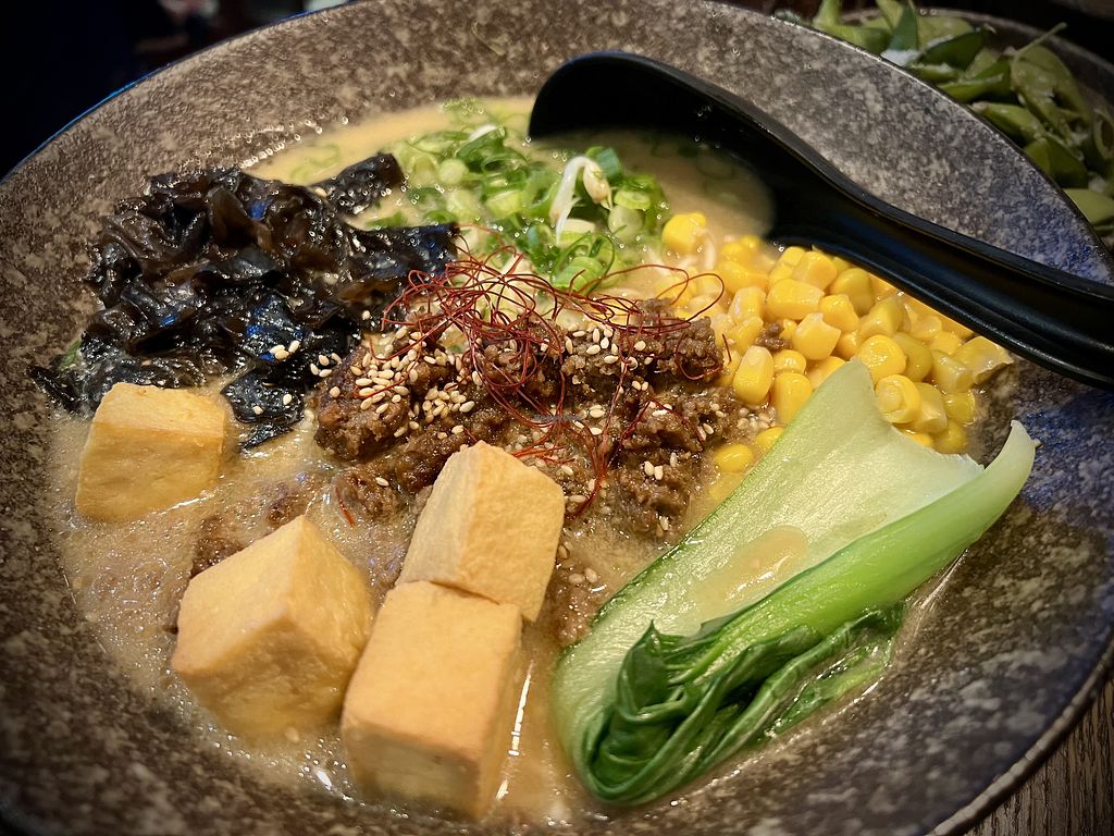 Vegan ramen soup with crispy tofu and vegan mince meat. Delicious!