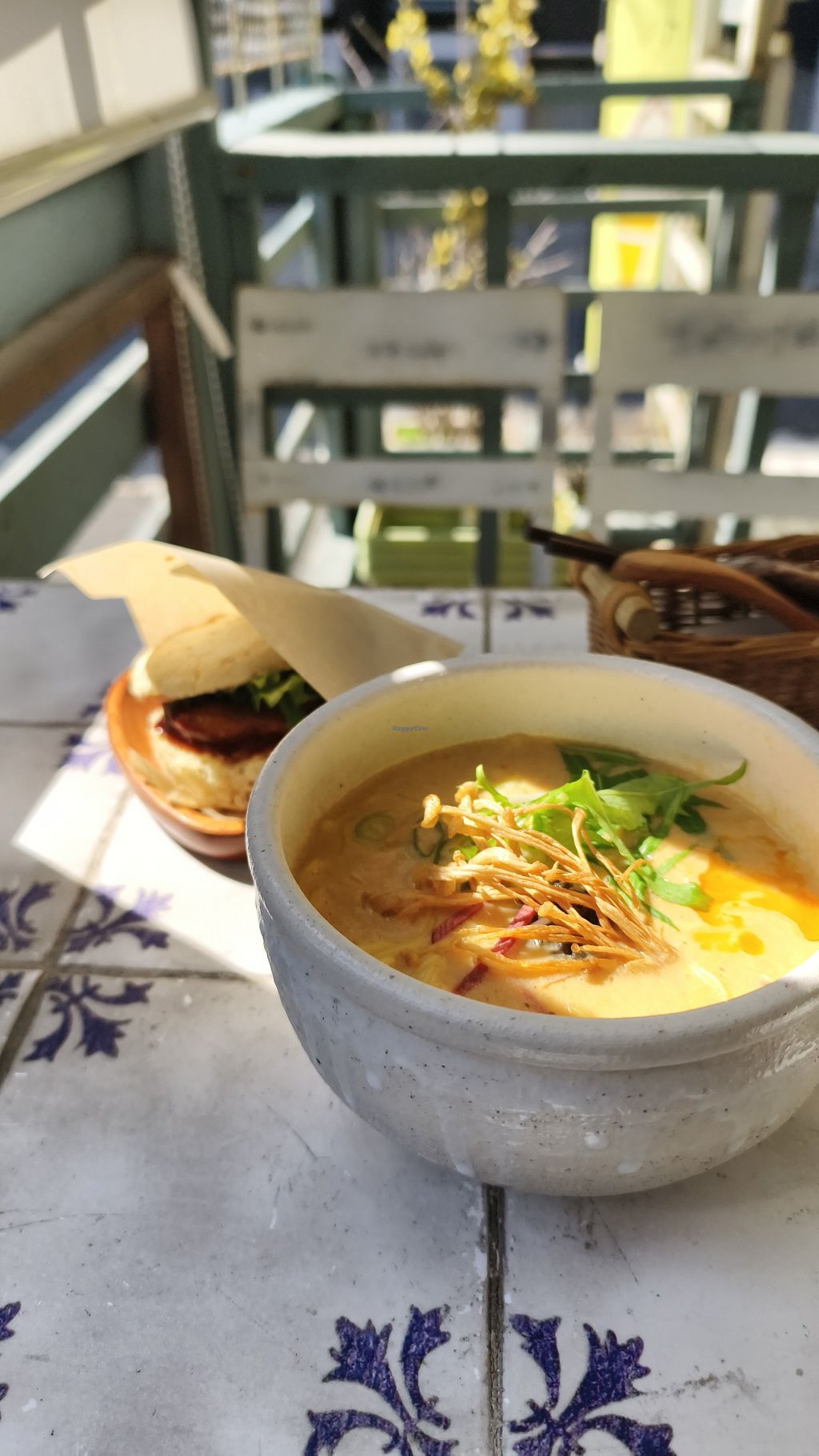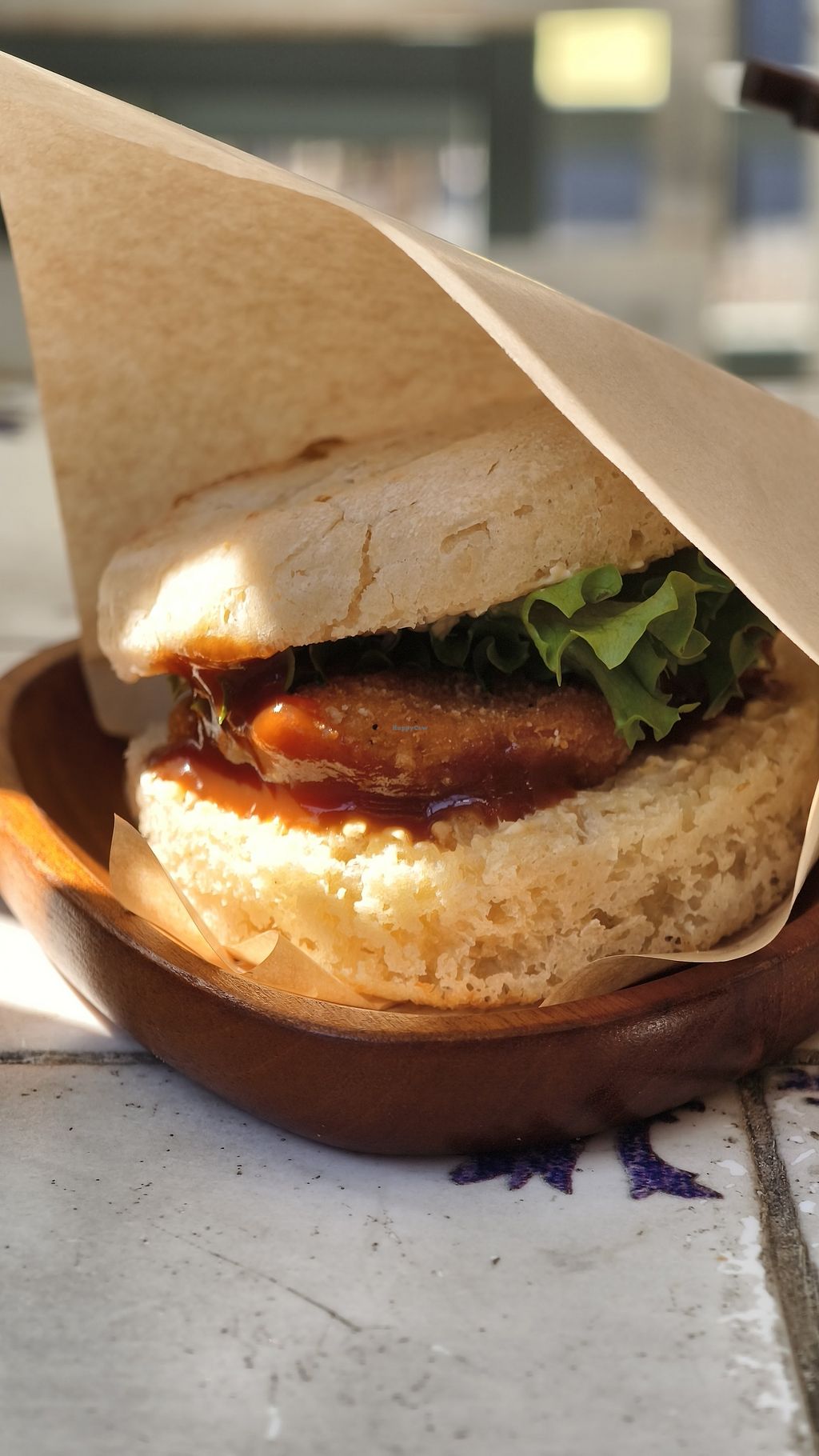 Assiette burger vegan, servie avec un assortiment d’entrées, ici salad…