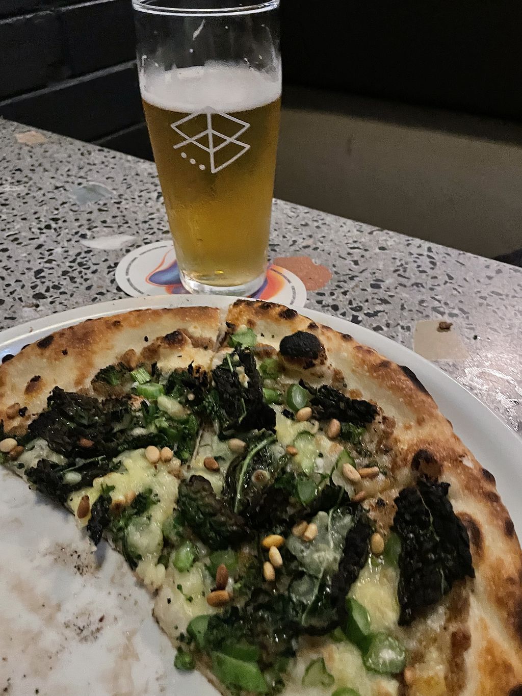 This place had a small food menu but the Woodfired pizzas are really good - simple and tasty. There are several they can do vegan with vegan cheese. We also had the flatbread as a side and it was also really good. Great beer too! Friendly service.