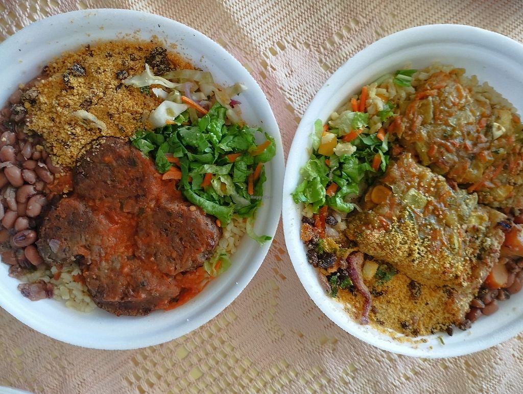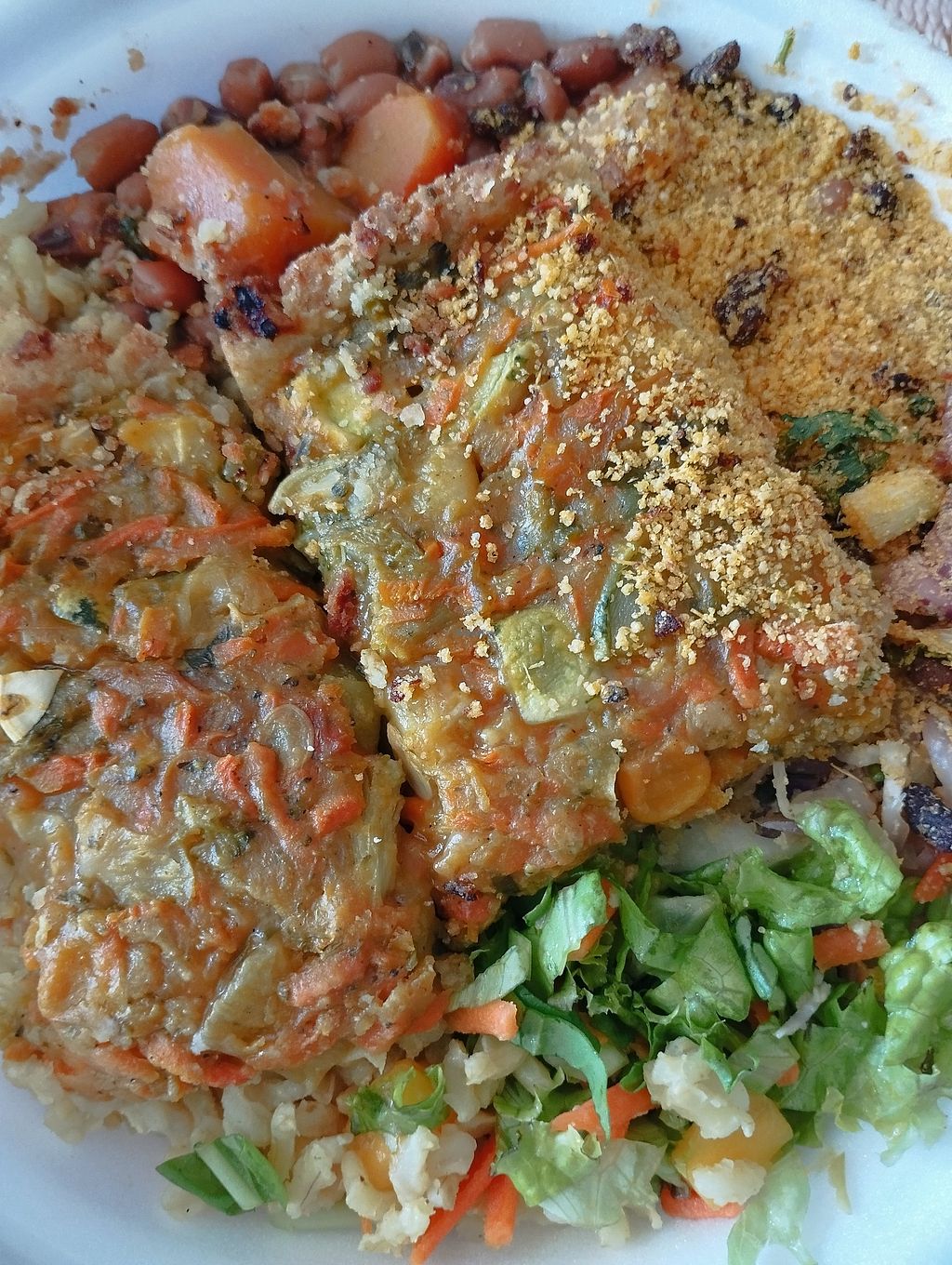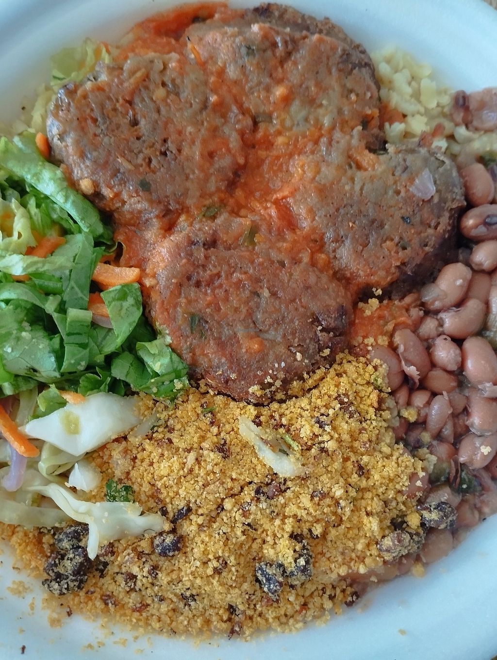 Hambúrguer de batata doce com gergelim, arroz, feijão, farofa e salada…