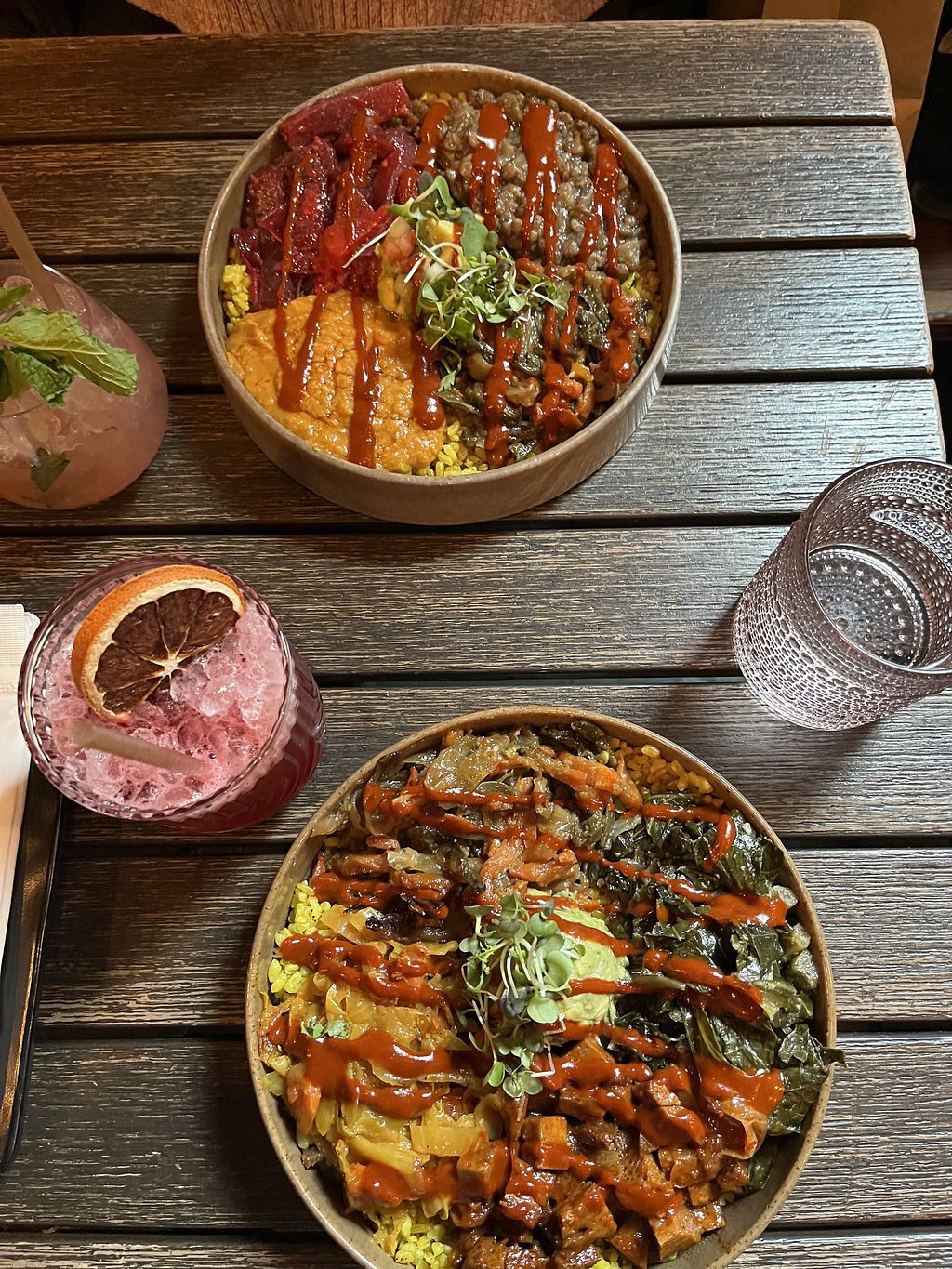 Love the vibe and energy of Ras. The staff’s kindness reflects the ethos of a vegan restaurant. The murals on the red brick are amazing, marking this place as undeniably Brooklyn. Ethiopian food is inherently communal, breaking bread and eating with your hands over shared platters. The Mercato or Piassa provide a variety of options; the former comes with red lentil stew, my fav Ethiopian dish. Ras shines brightest on its entrees though. The Dulet, diced royal trumpet ‘shrooms with onion and jalapeno, in particular, is so freakin’ delicious. Also, check out the curated cocktails and mocktails and if you still have room, the raw and kosher desserts. Totally worth it. There’s so much on the menu (with GF and kosher options) to explore and it’s a delight.