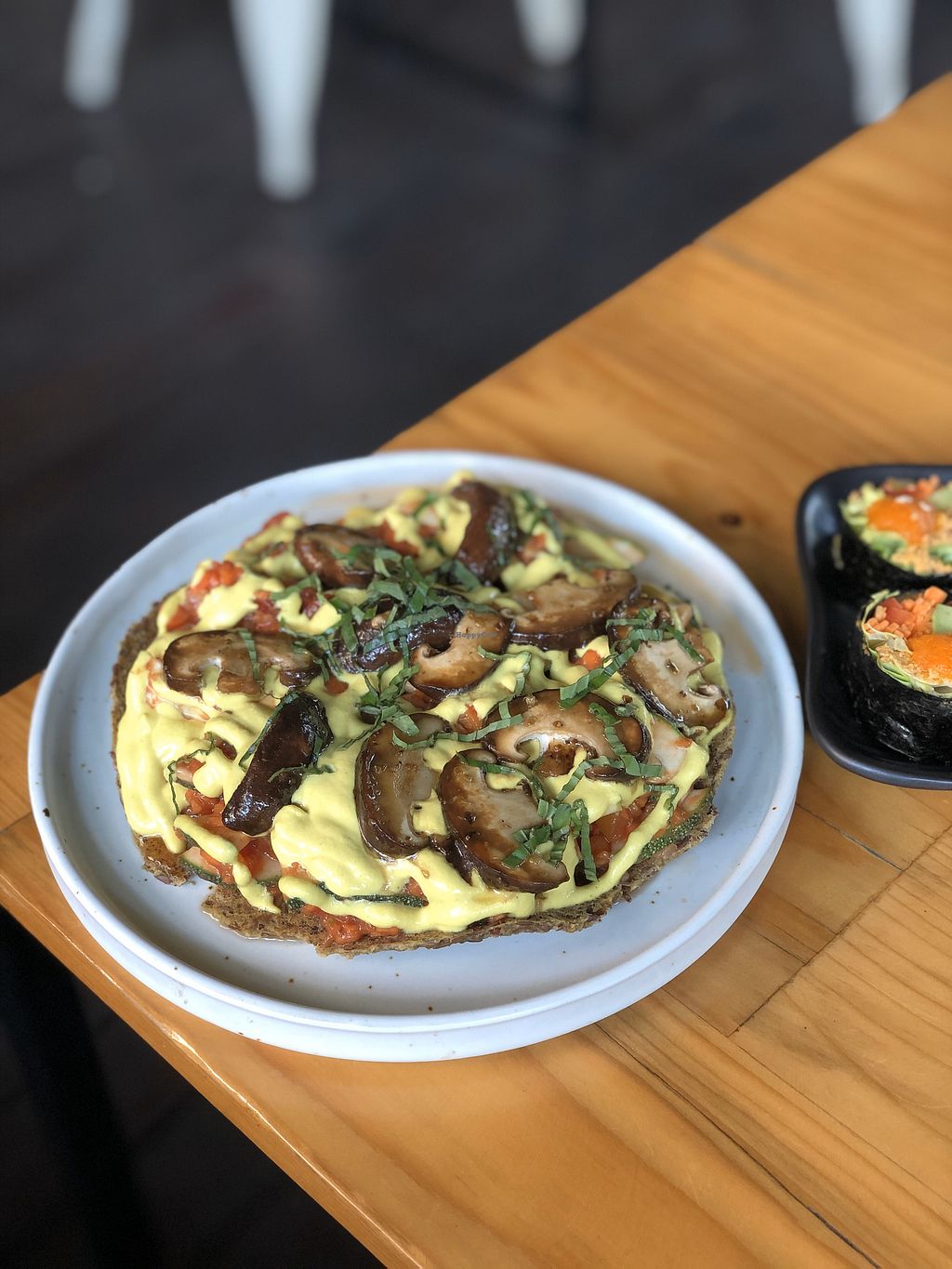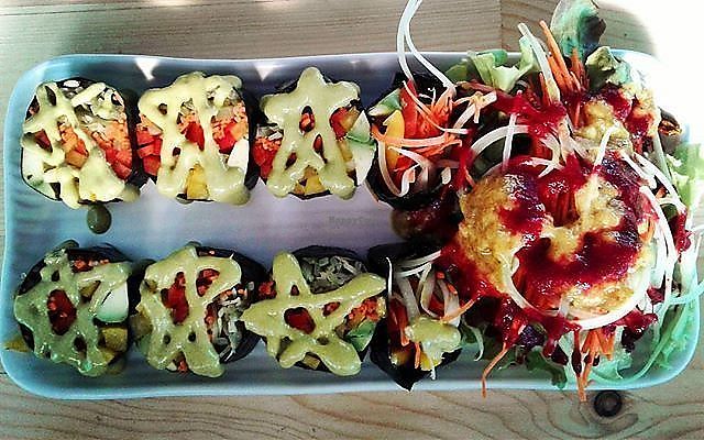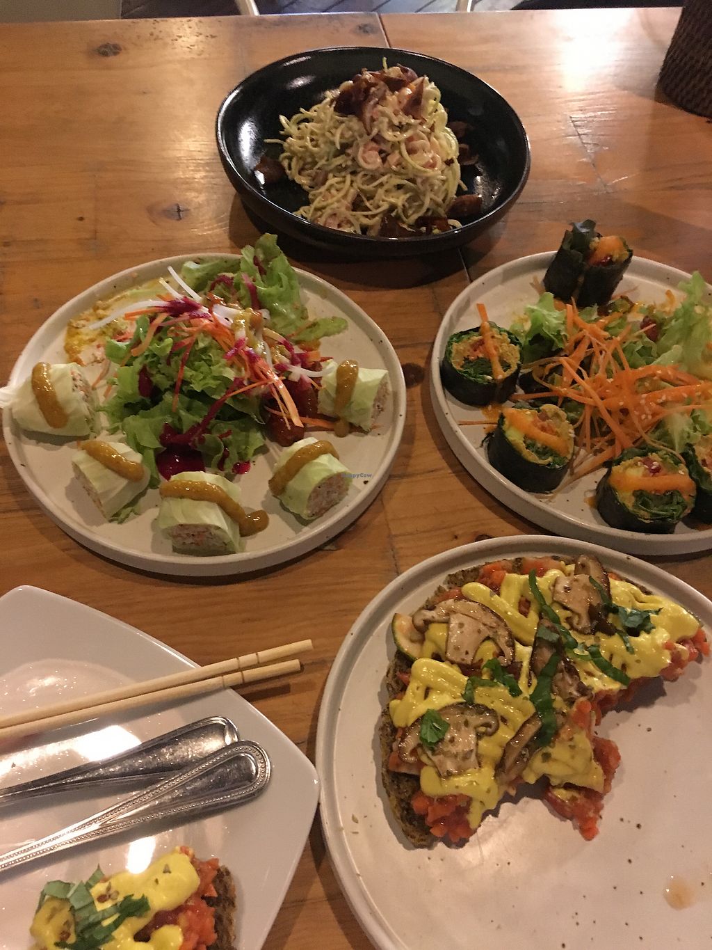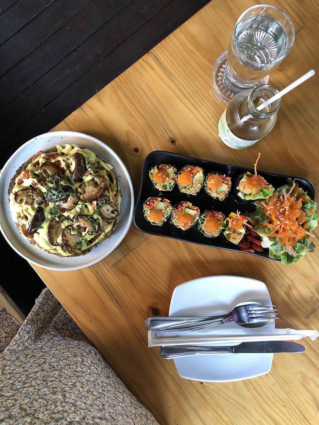 Spring rolls, sushi, mushroom pizza & zoodles
