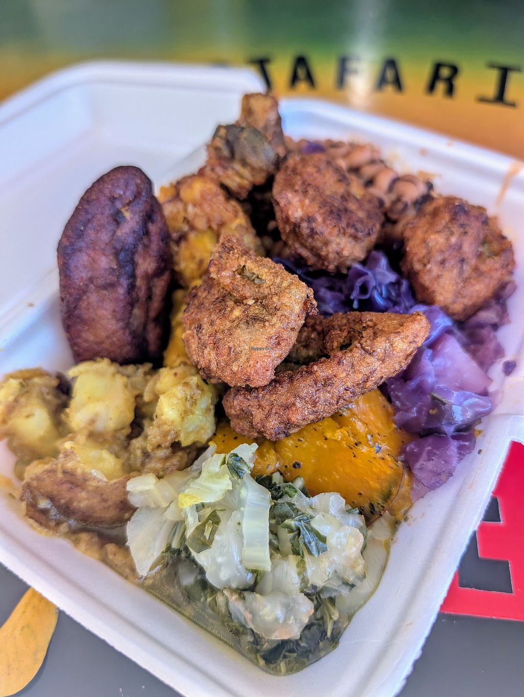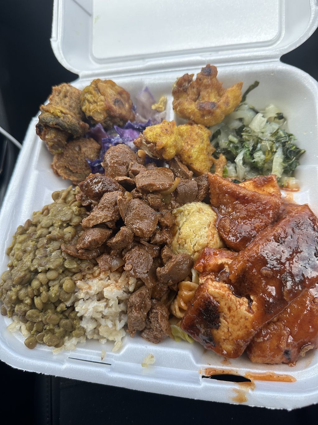 Large plate with all sides and the bbq tofu and veg chunks