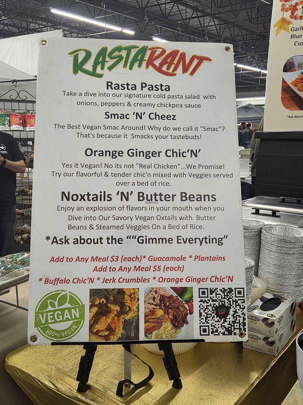 Read morePros: The vendor was helpful and friendly!, The Rasta Pasta!, The Orange Ginger Chick'n!