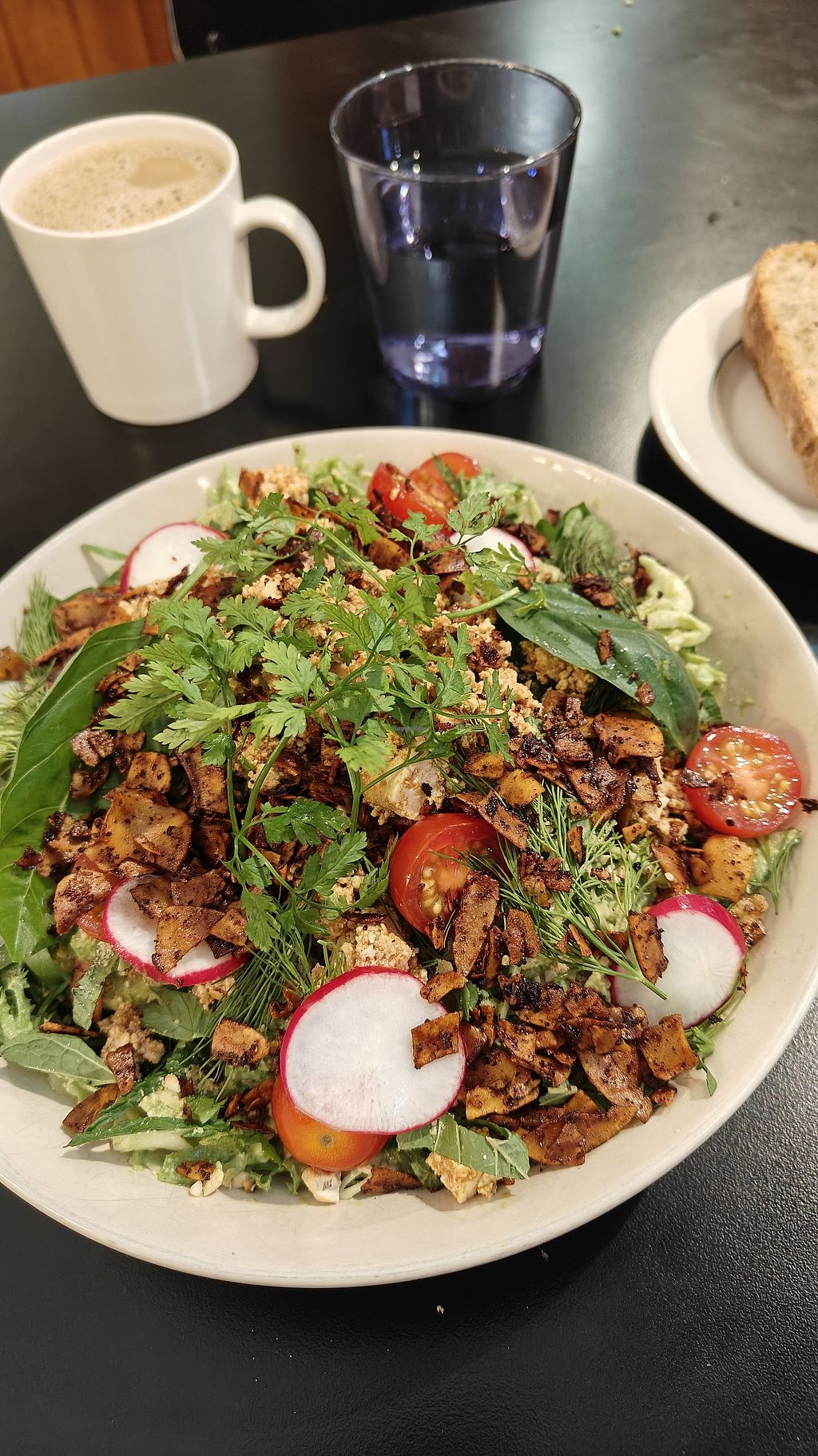 I had the warm lunch of the day which was a panang curry with tofu. It was so tasty! Bread, tea and coffee are included. It’s a nice setting, has good prices, and changes the menu daily. Will definitely come back!