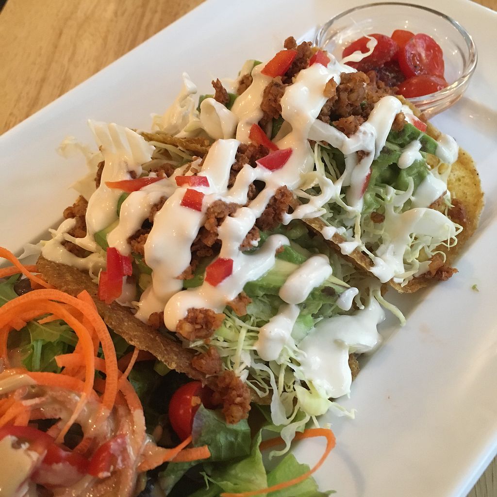 Raw quesadillas with salad, and the raw burger sandwich in the backgro…