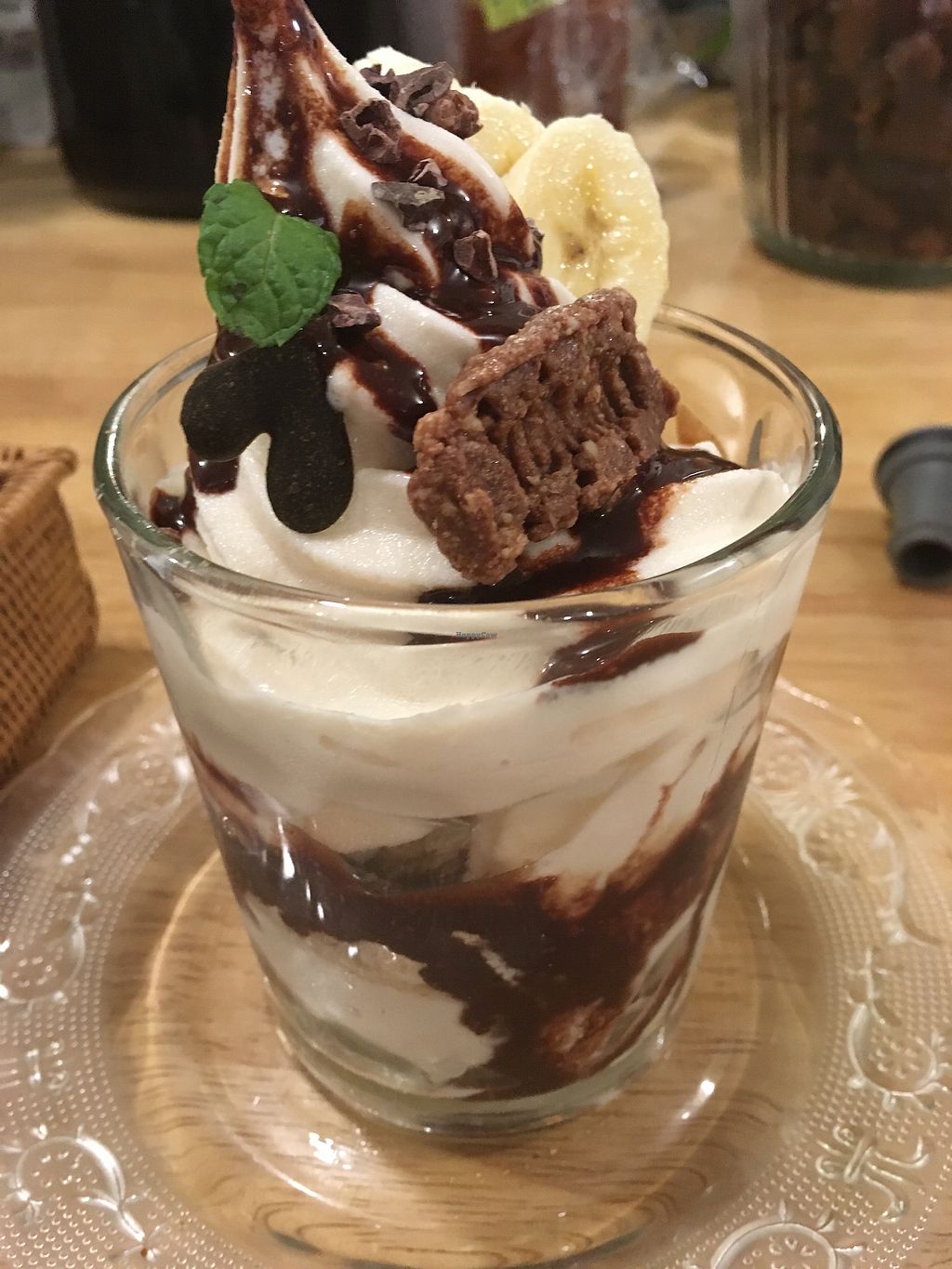Delicious parfait with soy milk ice cream, bananas and vegan chocolate…