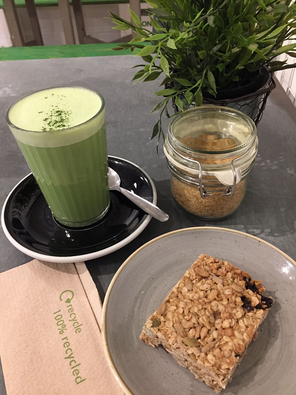 Coconut milk matcha late and breakfast bar. Yum!