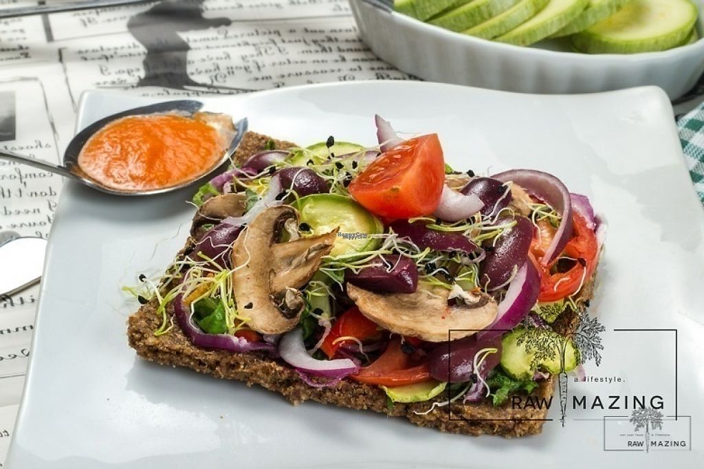 raw-vegan pizza with almond-flax crust. Deliciously crunchy