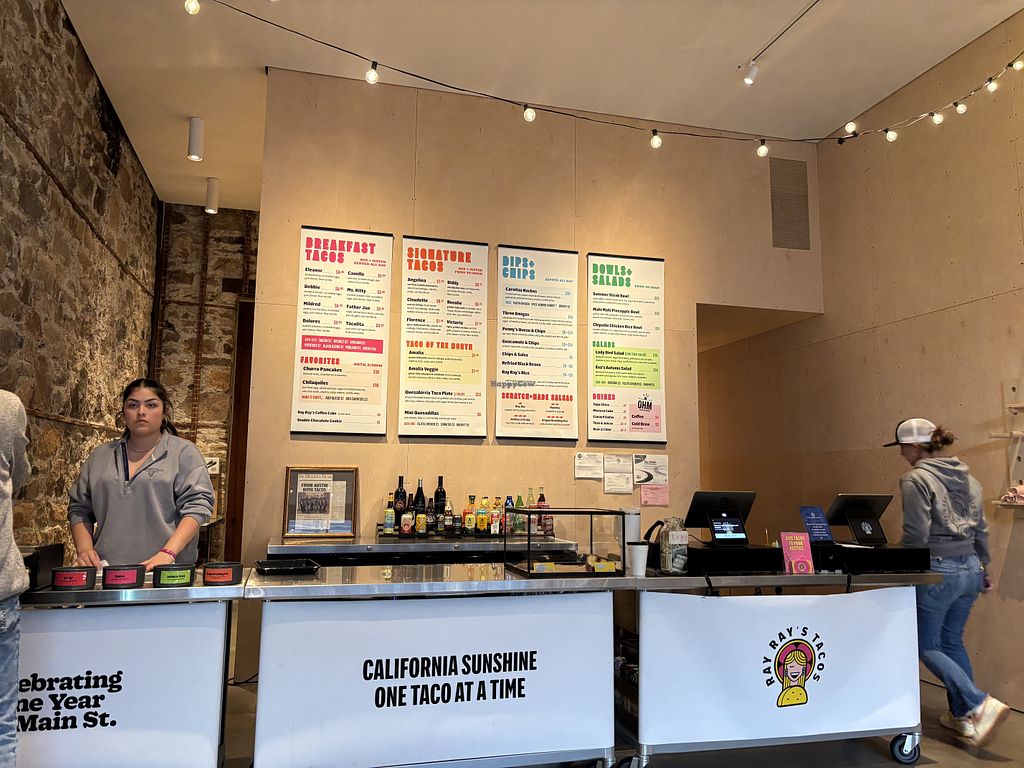Serves meat, vegan options available. Taco shop with salads, chips, coffee cake and more. Has some vegan taco choices, vegan refried beans, vegan cheese and spice-rubbed carrots. Also has some gluten free items. In addition, can be found at Saint Helena farmers market. Open Mon-Sat 7:00am-8:00pm. Closed Sun.