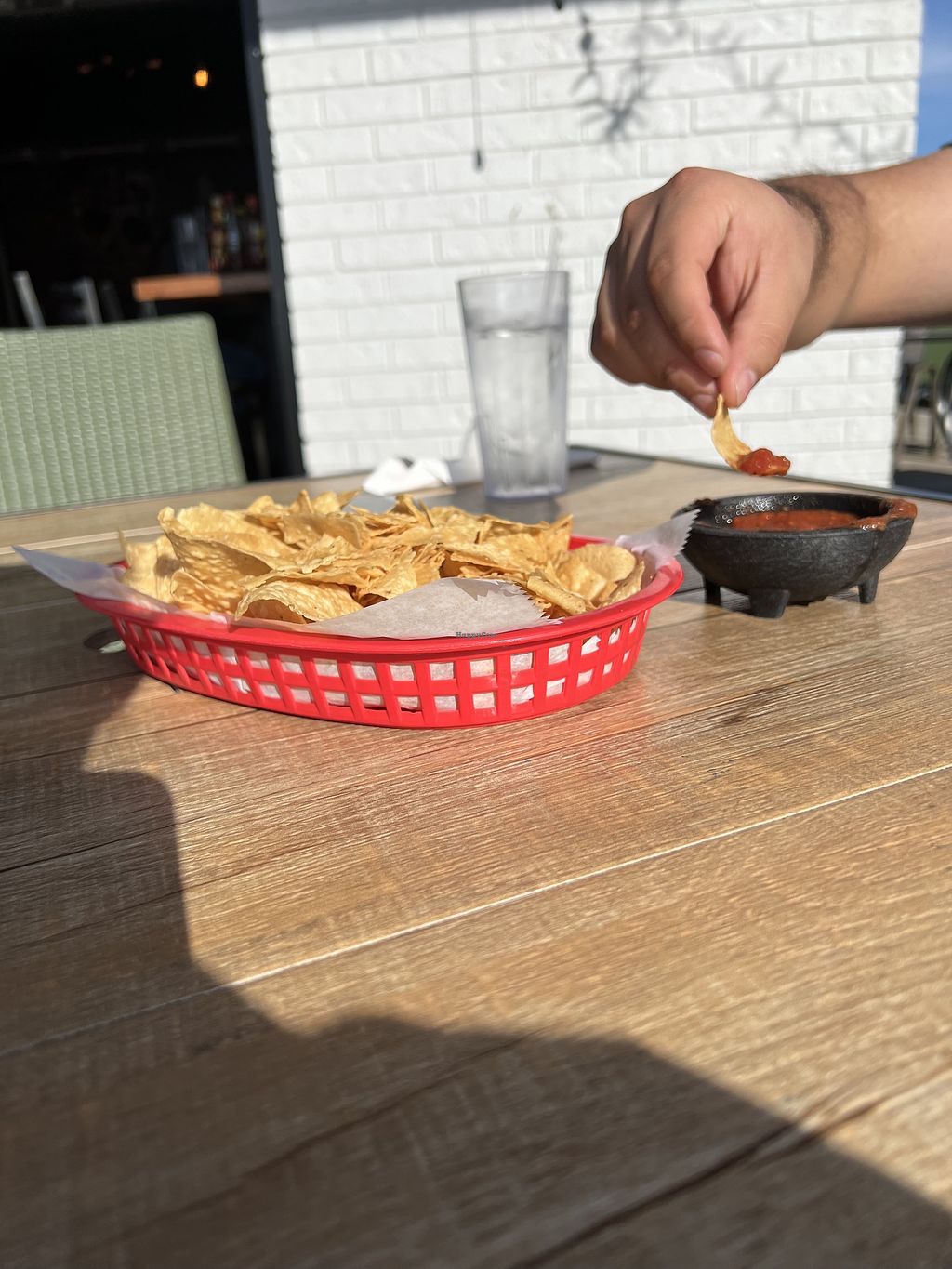 Chips, salsa, and guacamole topped with vegan cheese #Veganuary