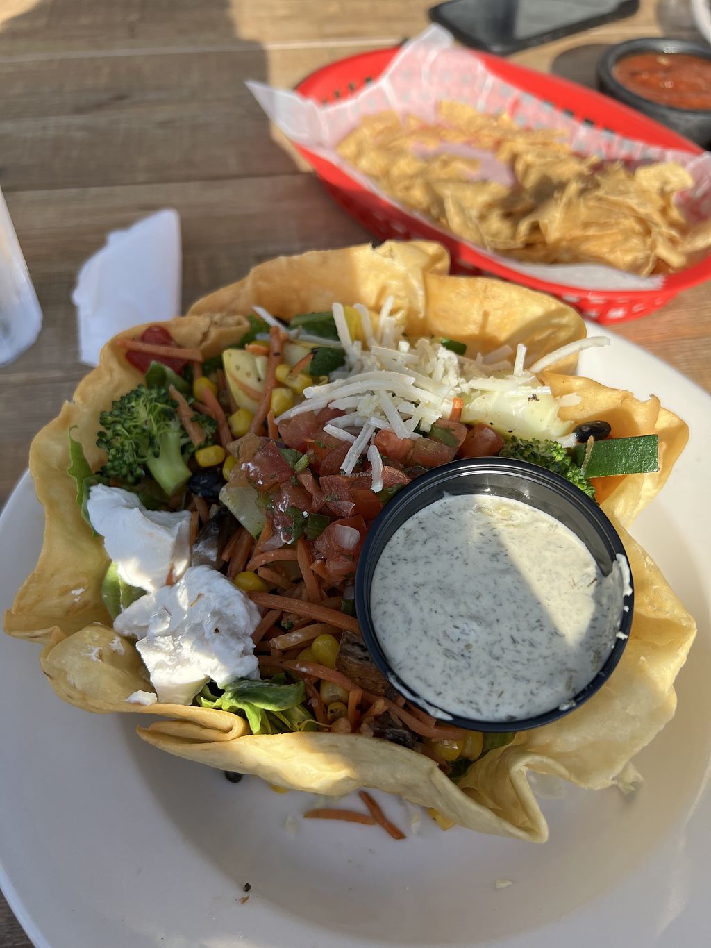 Veggie salad and veggie tacos with vegan sour cream, cheese and ranch!…