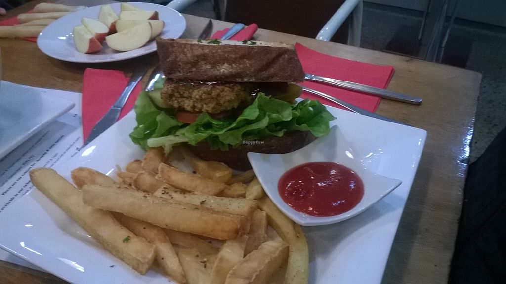 What a delight to find this cafe in the heart of a rural town where you wouldn't really expect 'real' vegan food. Situated in a little mall, next to the New World supermarket with lots of parking behind the arcade, it is easy to find and spacious. Lovely helpful staff and lots of clearly labelled vegan and paleo options. Excellent range of organic juices and they even make their own cashew milk for coffee (thought they offer soy too). On the day I went, the (vegan) soup was roasted tomato. I skipped soup as I wanted dessert later so started with the mains. We shared the vegan curried veg and cashew pie which was lovely. I ordered it with salad as all the salads are vegan. But I could have had it with wedges or fries. The vegan burger was really good - big fat tasty burger patty served with excellent fries that looked home made. It was a very generous serving. For dessert, we ordered a raw chocolate avocado cheesecake, a cappuccino pie and a cardamom apricot coconut cup. I liked them all but my fav was the cappucino pie. They sell Nice Cream tubs so we got one of the mini tubs of vanilla ice cream and ate that with our desserts.