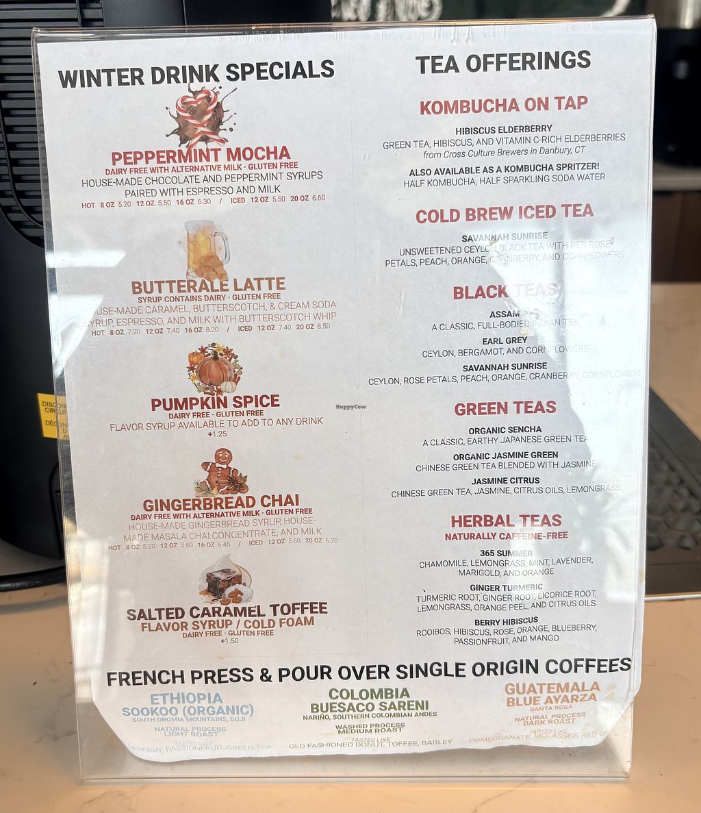 Found this on the drive from Hartford to NYC, just off the highway. Nice selection of seasonal coffee drinks, clearly marked non-dairy options. The chocolate chip scone was delicious.