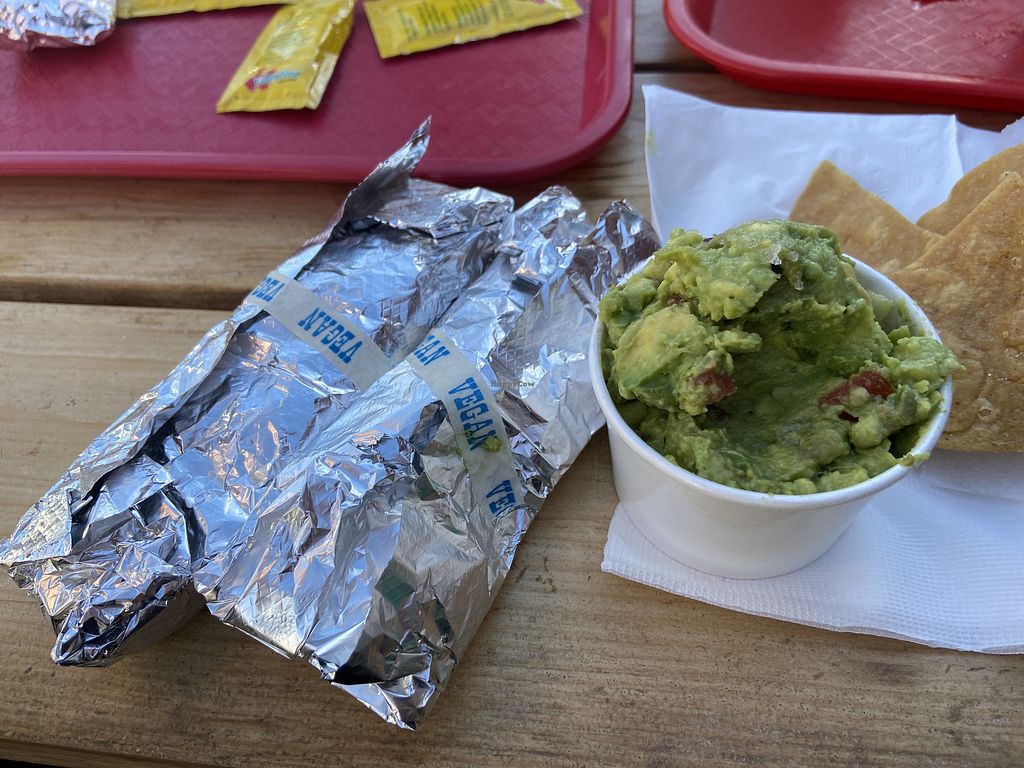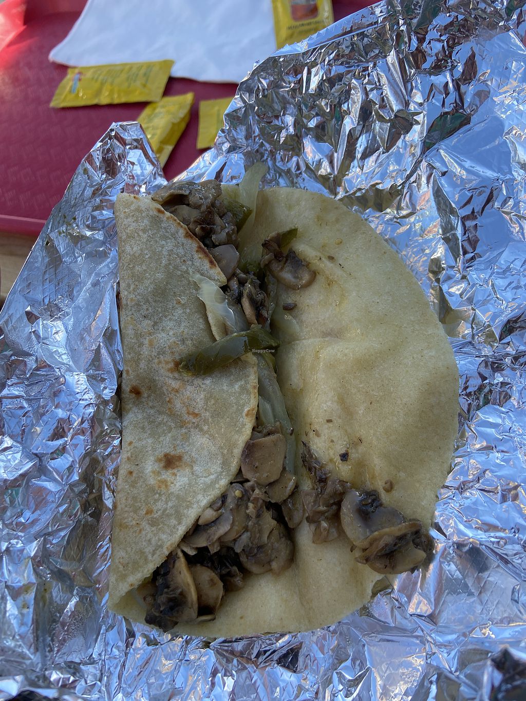 2 Mushroom Rajas tacos (vegan) & side of guacamole and chips