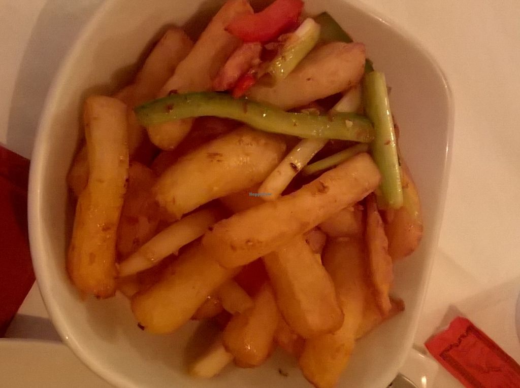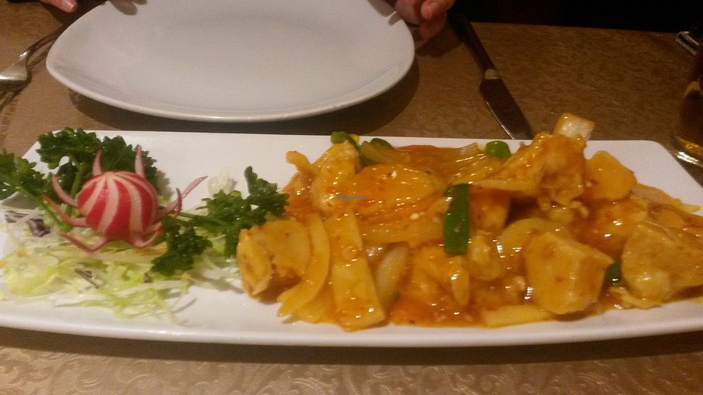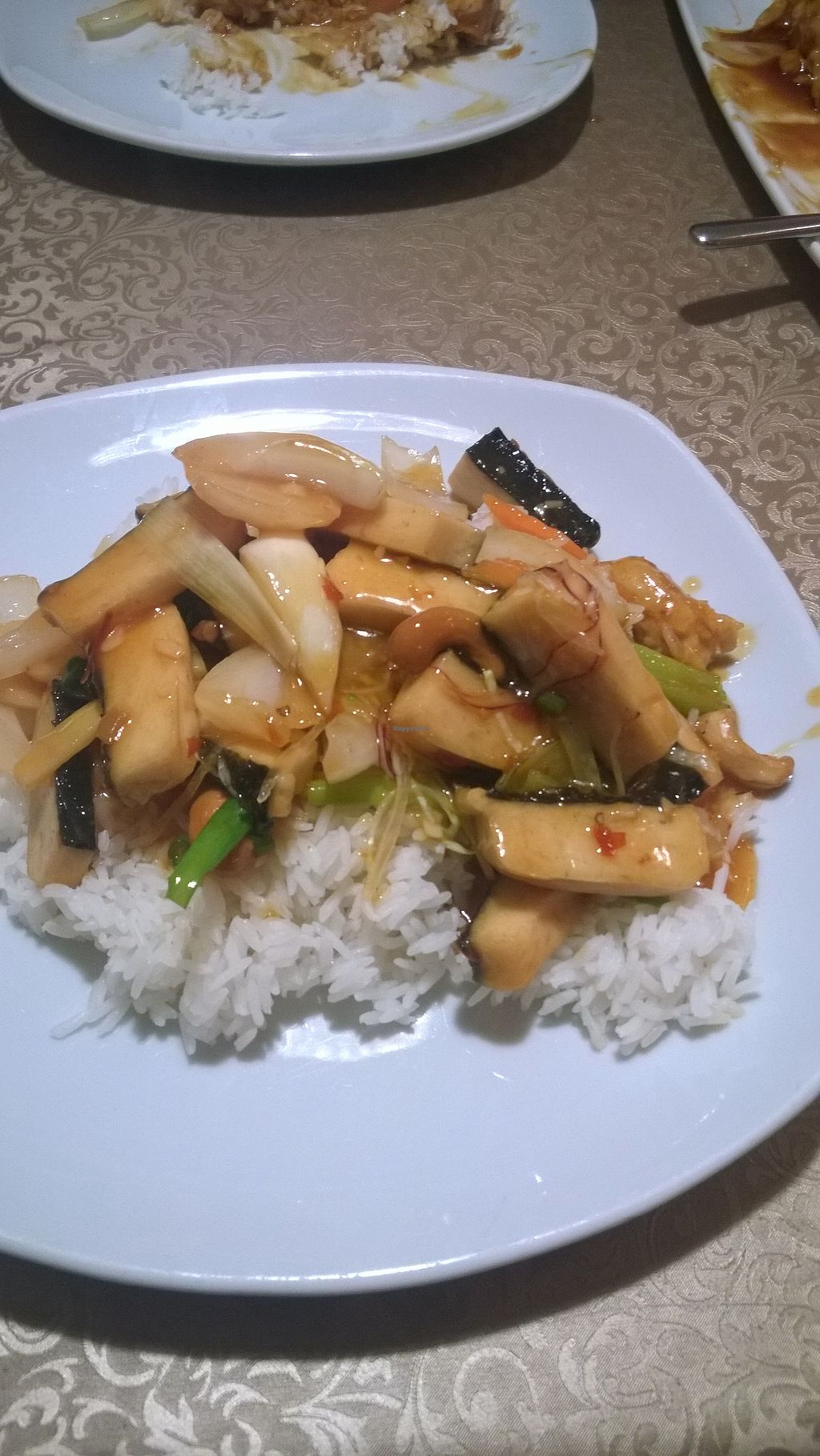 Vegan hoisin duck, Mongolian veg, salt and pepper chips, rice and my f…