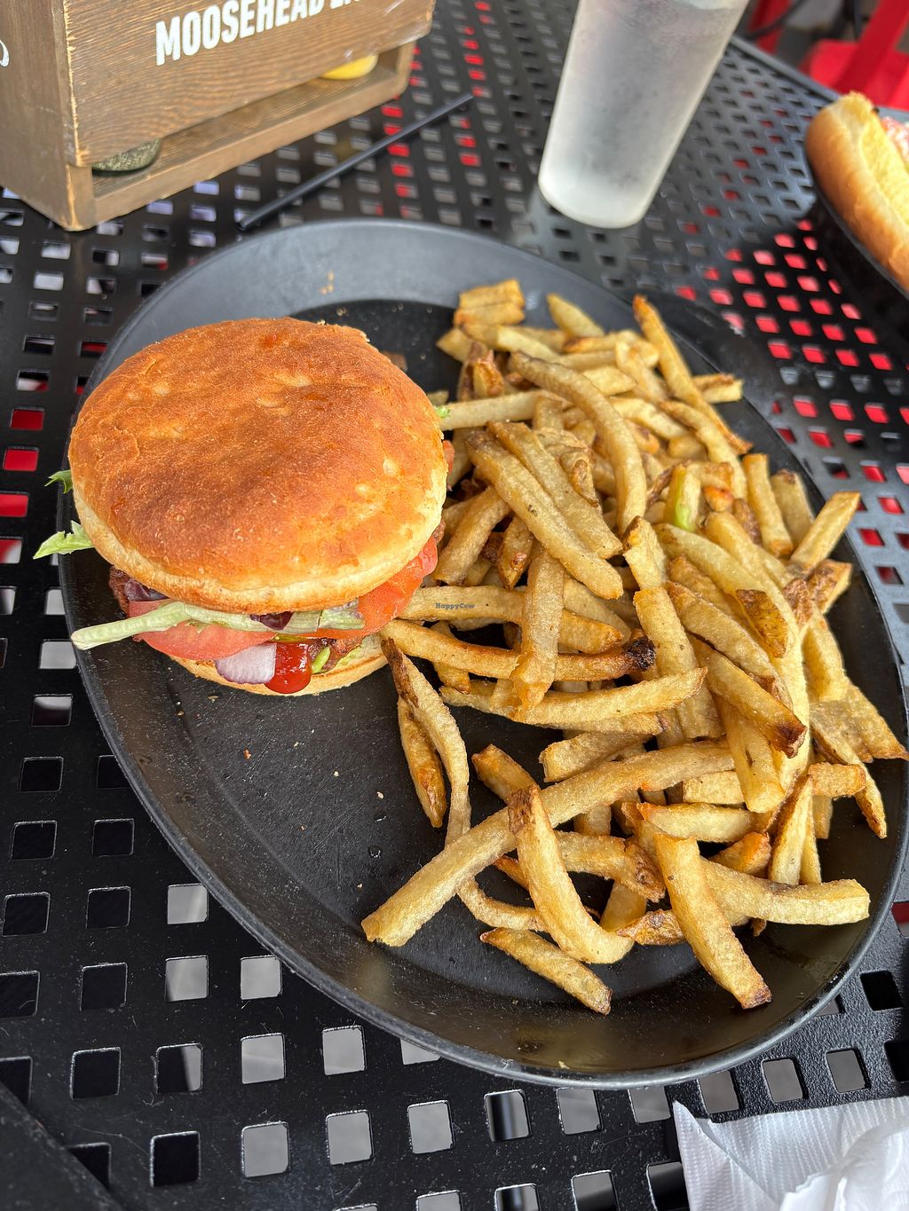 The staff was knowledgeable wnough and informed me (upon ordering just fries) that the gluten free bun was vegan. The bun was actually decent for a gluten free bun. The burger was a beyond-style but hand-molded and not too bad either. Lettuce, tomato, onion, pickle, and guacamole.