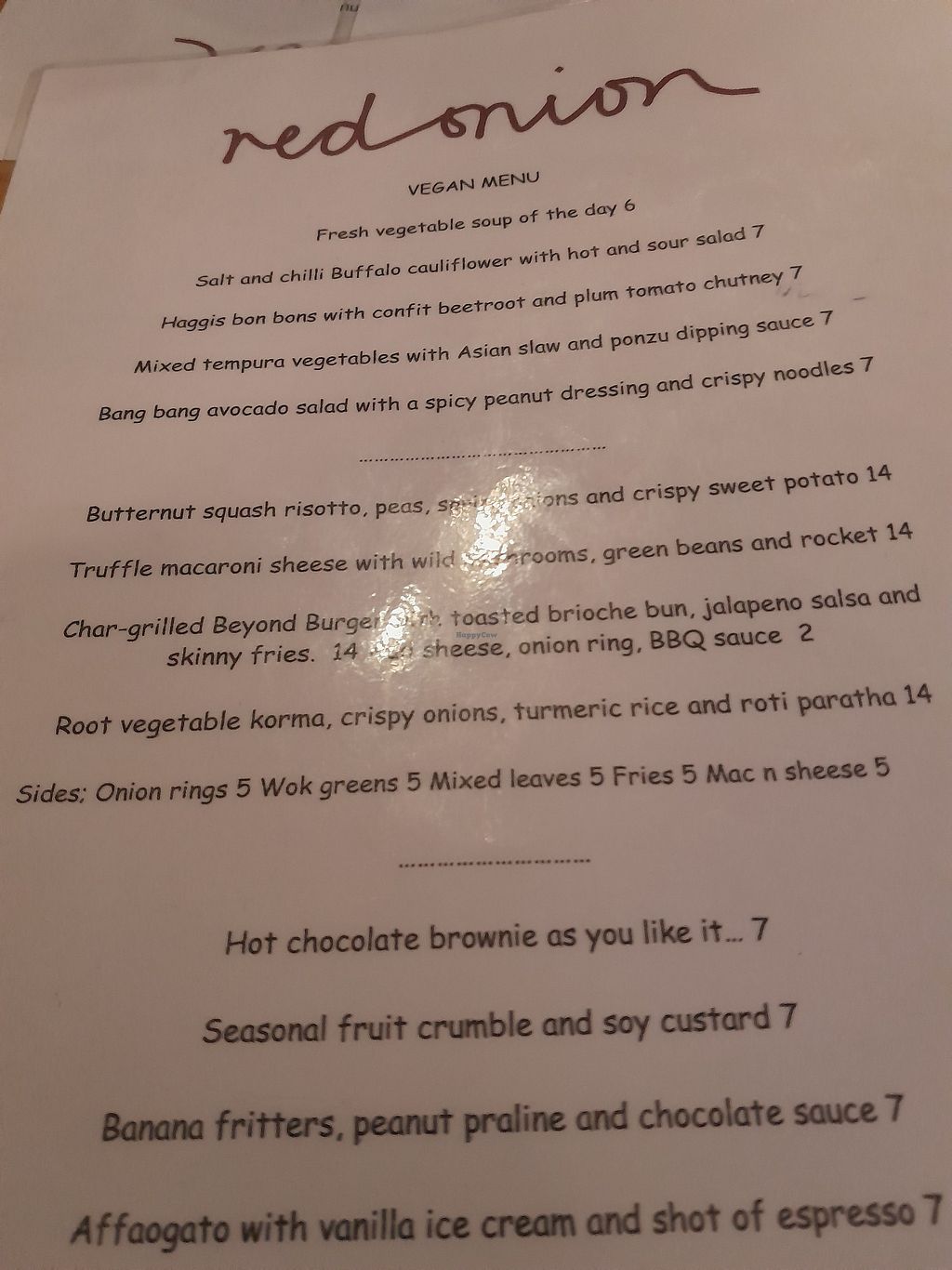 The Red Onion was recommended to me by the owner of my favourite vegan restaurant in Glasgow for when they had a night off. It is a lovely restaurant with nice attentive staff. The vegan menu is varied and tasty, good value, the evening was relaxed and unhurried. Very nice indeed, thank you!