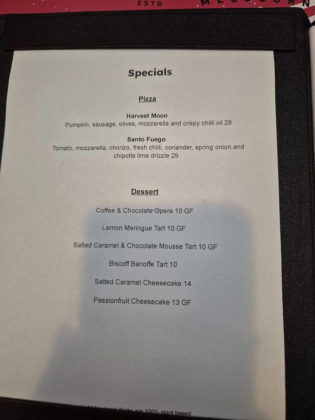 2024-05-24 I saw half their bookings had been cancelled. I had the late special pizza. It was so tasty. I loved the nuts and mint and the “lamb” they used. It was prepared really well. Then we tried the “mitey” cheesecake” which I wasn’t sure about, caramelised Vegemite, but wow! One of the best desserts ever!