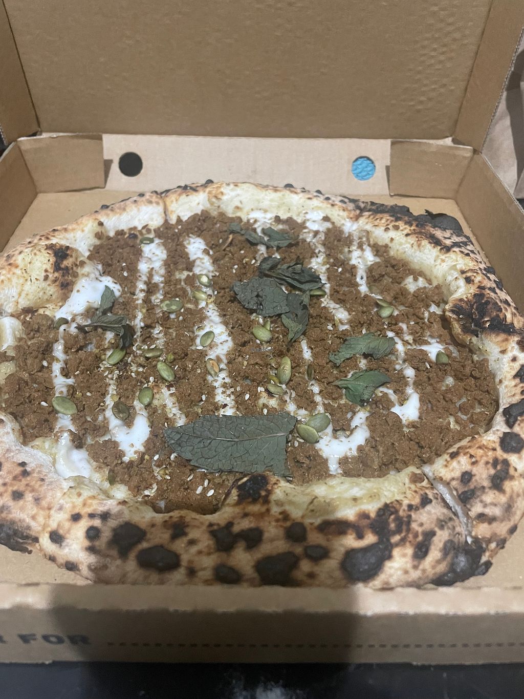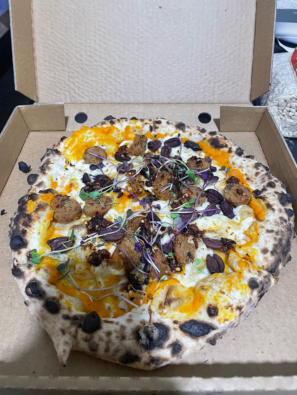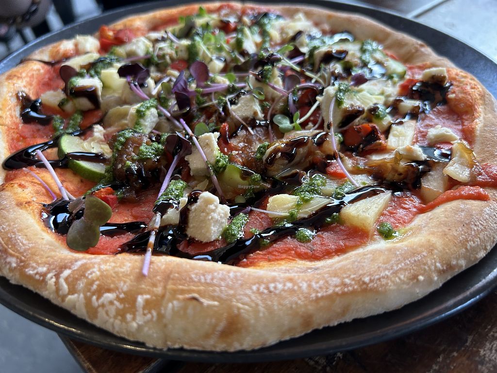 Phenomenal vegan pizza.🤩 The flavours were phenomenal, the pizza had a delectable thin crust with a slight doughyness at the edges. Yummmmm 😋 The goats cheese was so realistic it gave me trust issues. Seriously you’ve gotta go here!!!!!