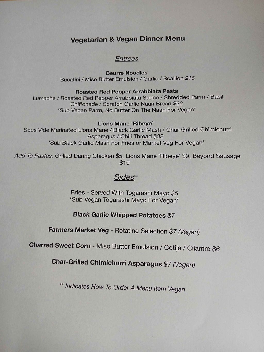 Serves meat, vegan options available. BRestaurant offering veganizable Midwest fare like "Lions Mane 'Ribeye'" (marinated mushroom with black garlic mash), "Fake Fish Bao" (Gardein filet with green curry remoulade), and "Imposter Burger" (Impossible patty with smoked jalapeño). Open Mon-Thu 11:00am-11:00pm, Fri-Sat 11:00am-1:00am, Sun 11:00am-11:00pm.