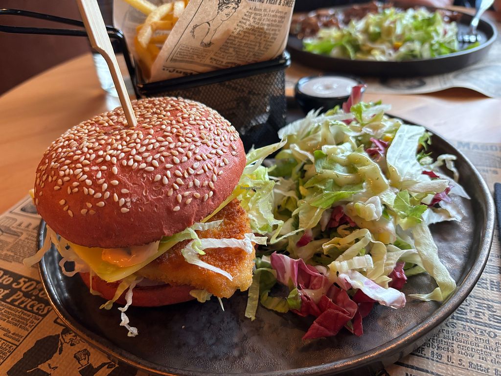 Crispy chicken burger menu w/fries and salad