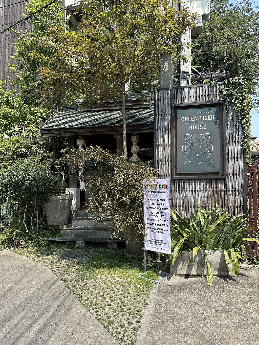 Garden restaurant at the Green Tiger House guesthouse, located inside Chiang Mai’s Old City. Offers lunch and dinner, and is open to the public. Menu features a variety of dishes and drinks, from western style burgers to Thai dishes. Fully vegan since 2017. Open Mon-Sun 9:00am-10:00pm.