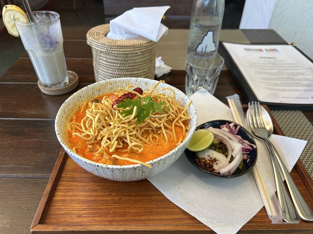 Had the papaya salad and the Khao Soi. Both very good quality. 100% vegetarian cafe with a lovely garden