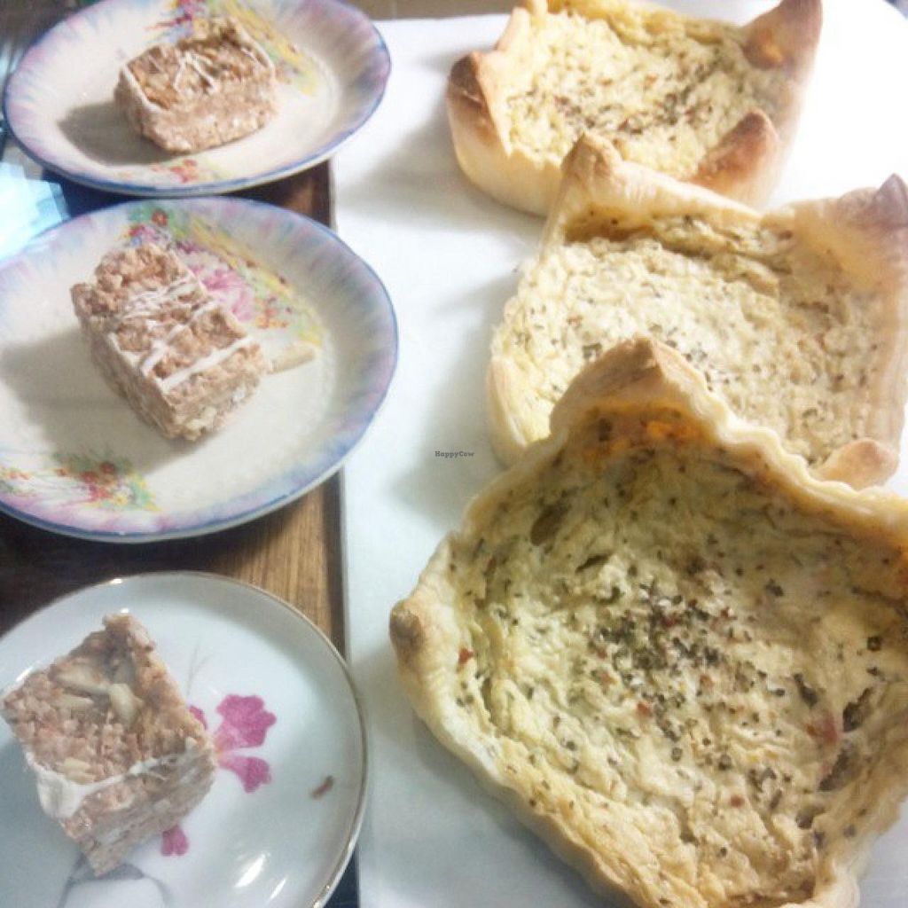 vegan and gluten free coconut slice and spinach and 'bacon' quiche.