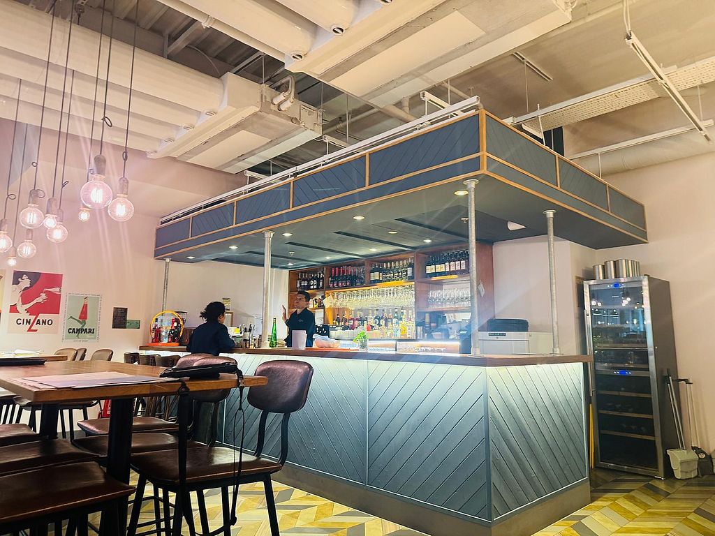 Serves meat, vegan options available. Italian restaurant and pizzeria offering vegan starters such as bruschetta, focaccia, and minestrone. Vegan mains include ajo, oio e peperoncino pasta, tomato and basil pasta, arrabbiata pasta, marinara, and the option of vegan ParVeggio cheese. Vegan dessert includes torta caprese chocolate and almond cake. Open Mon 12:00-17:00, Tue-Fri 12:00-20:30, Sat-Sun 12:00-22:00. Open Wed-Sun 11am-10pm.
