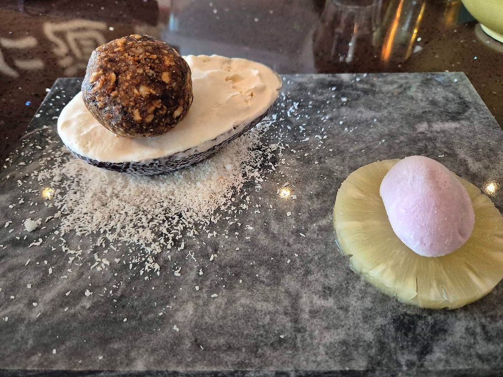 Vegan icecream in avo shell with a nut and date ball stone, frozen str…