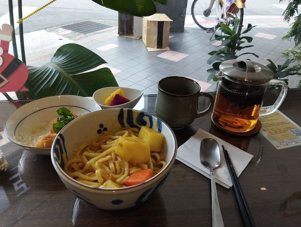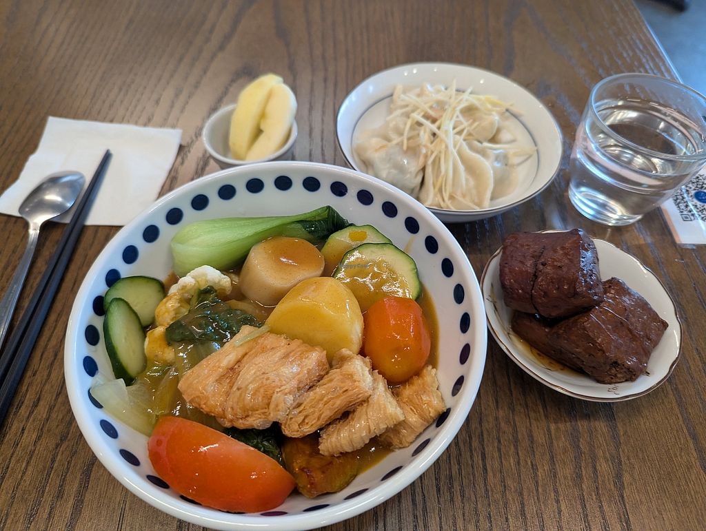 A collection of sides, clockwise from front: fried yuba; fried vegan e…