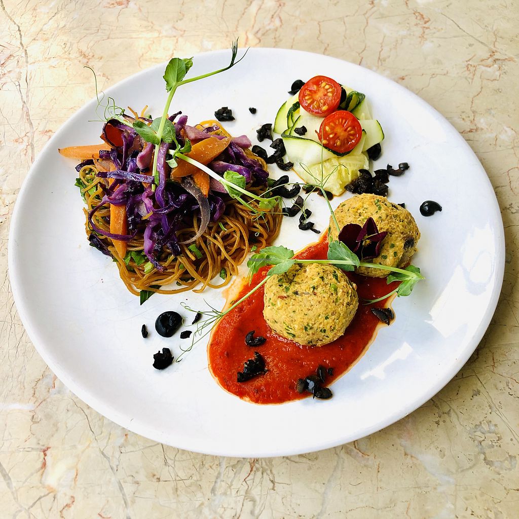 Rice noodles, purple cabbage, roasted carrot, soy sauce; grain balls, …