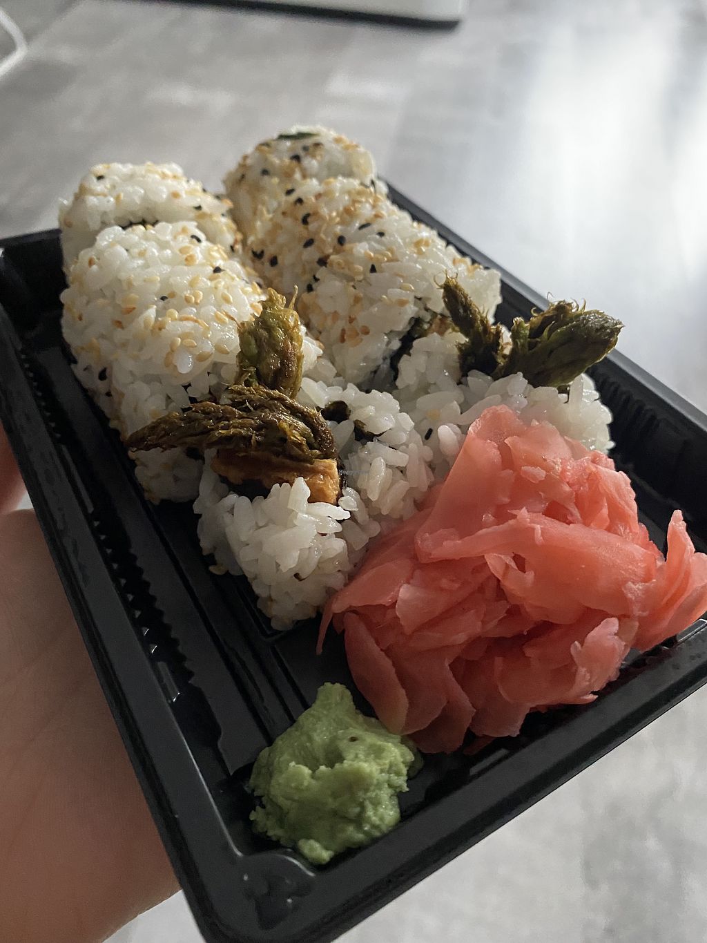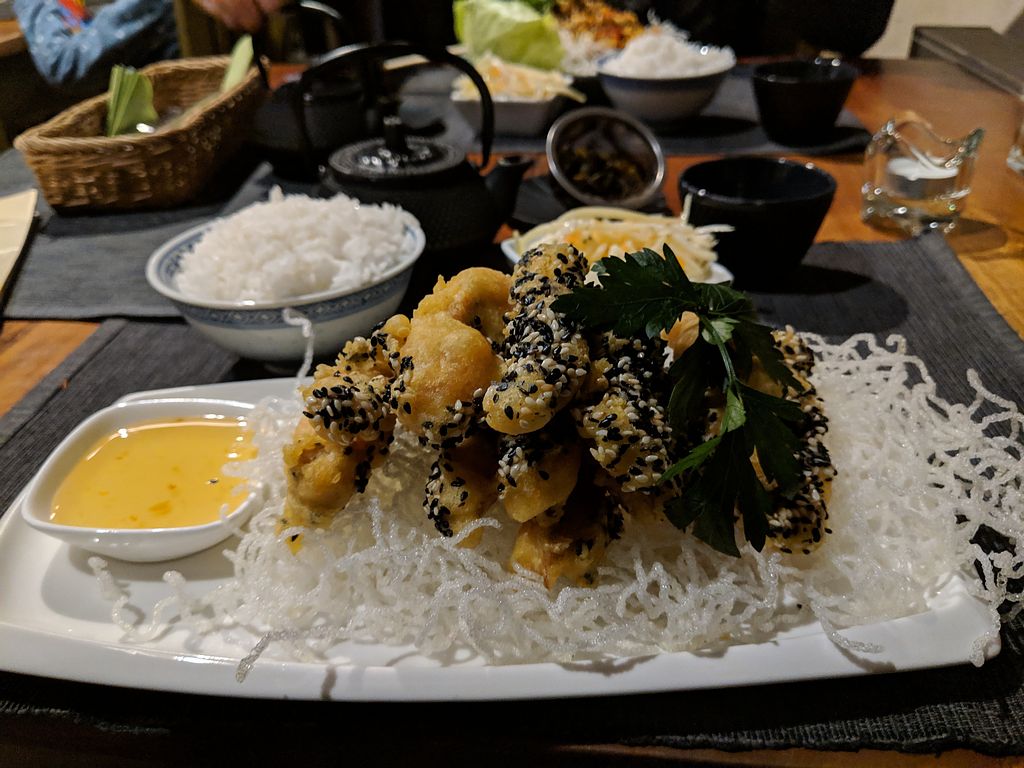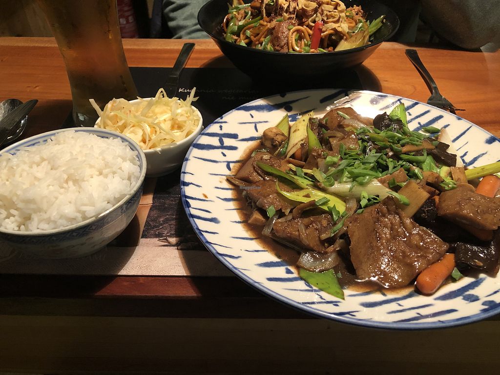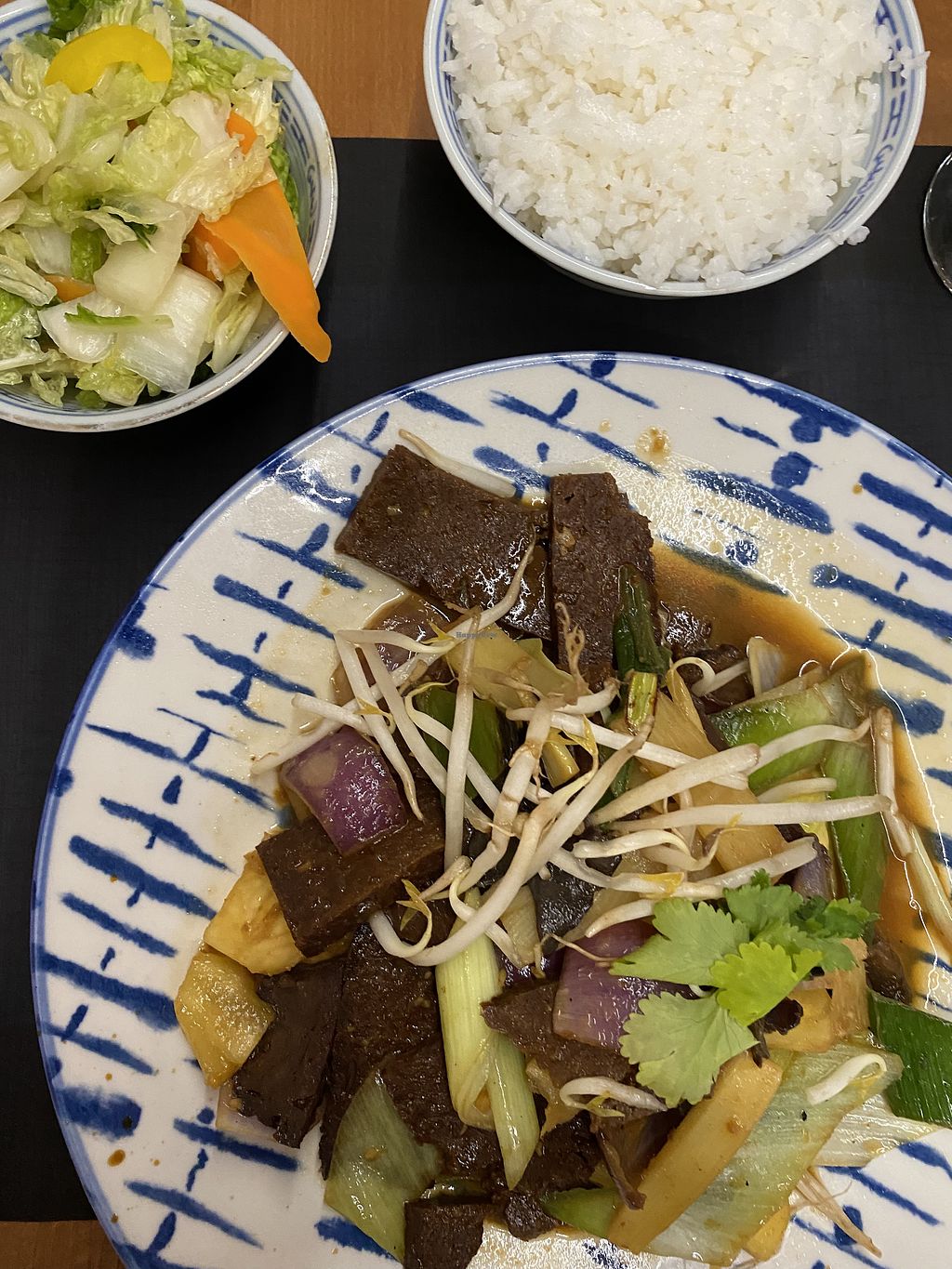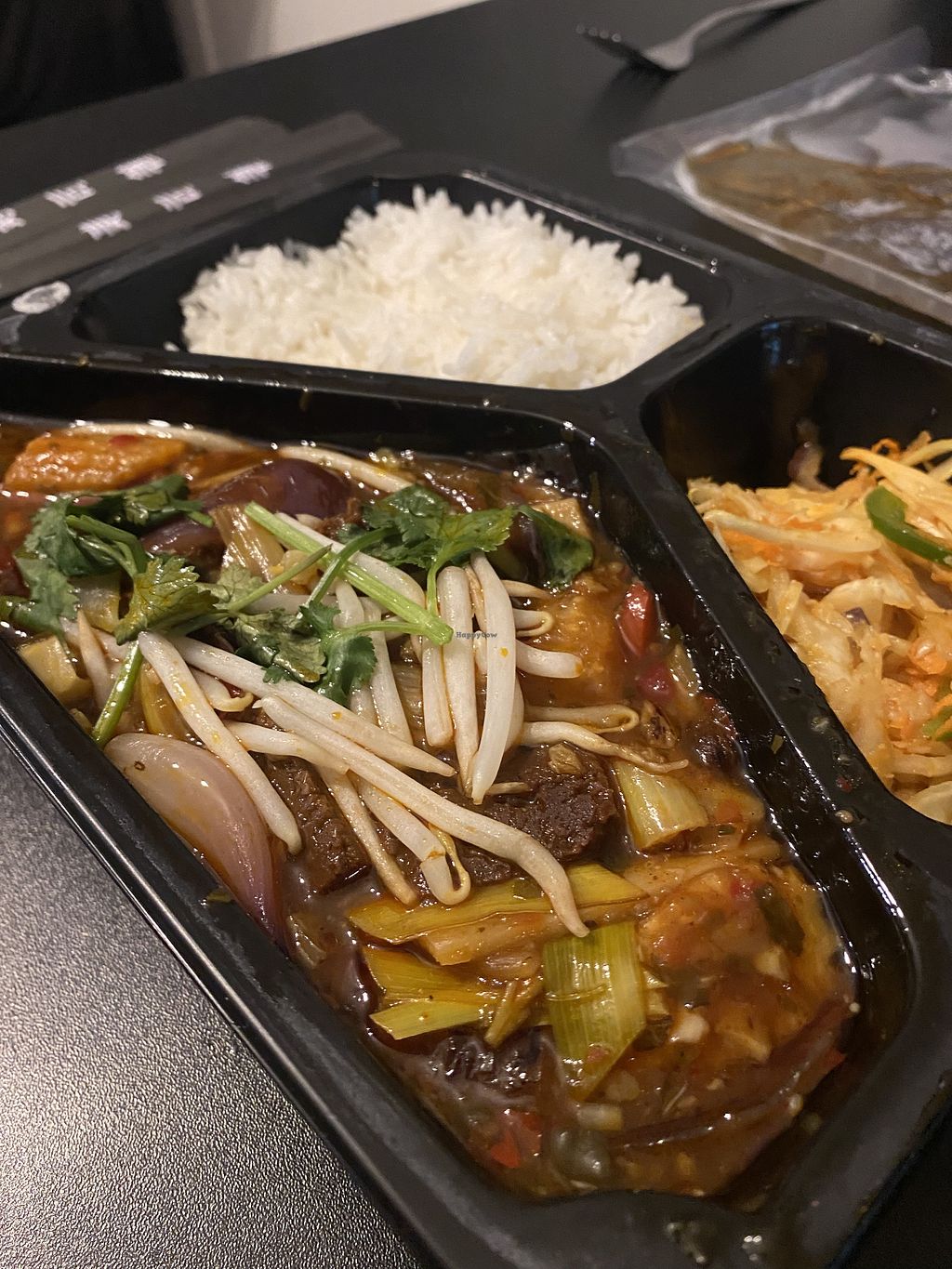 Tofu salad (too oily) and red curry with vegan ”beef"