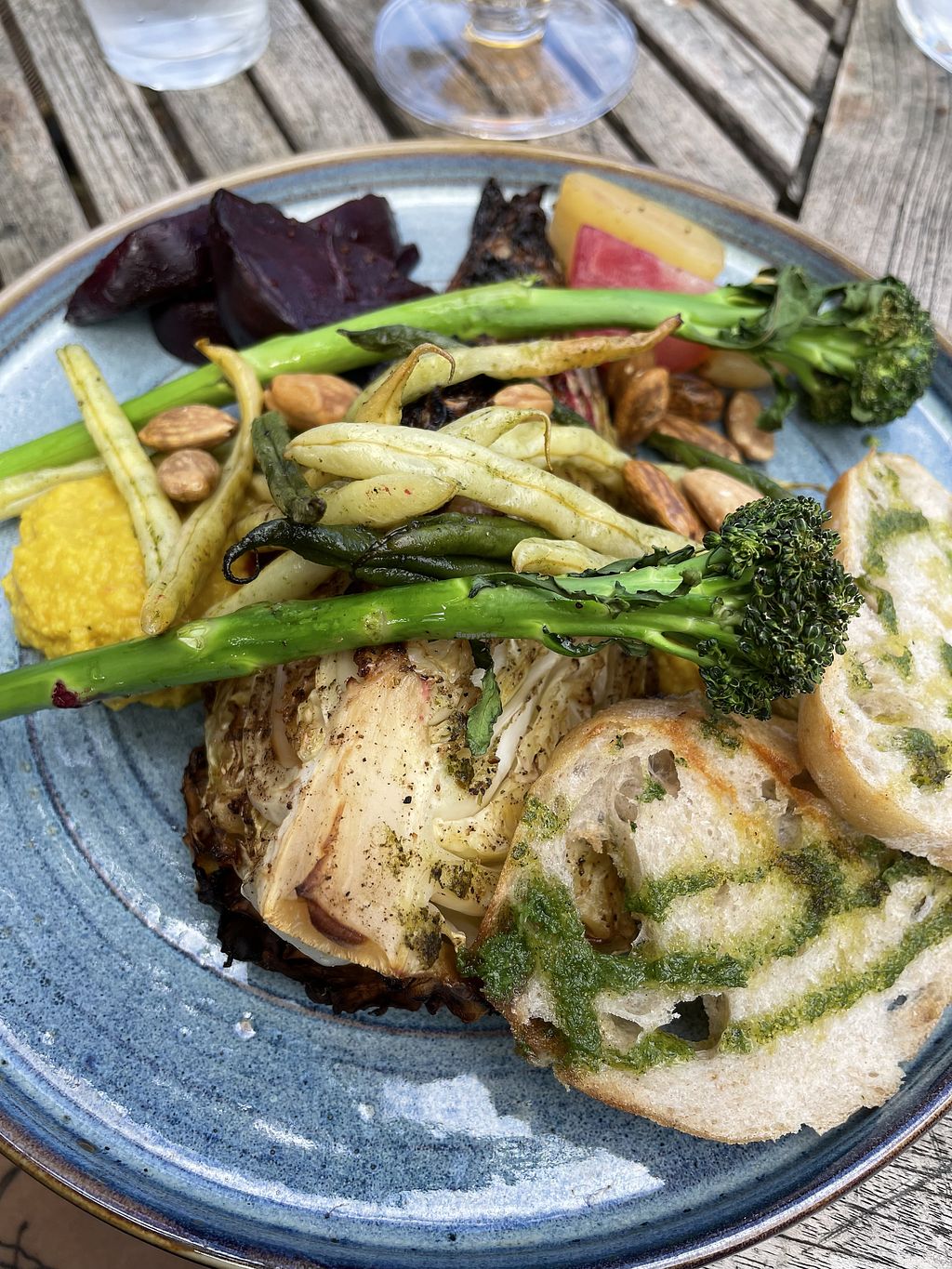 Cauliflower with a vegan majo, beluga lentils, champignons and dill