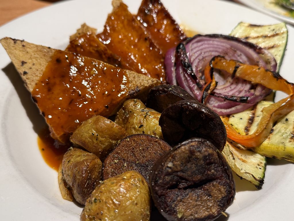 Service was extremely slow. Server however, was apologetic and offered a free dessert (nothing available for Vegans). I had the beet salad minus the cheese. My husband had the blackened cauliflower and kale which was good.