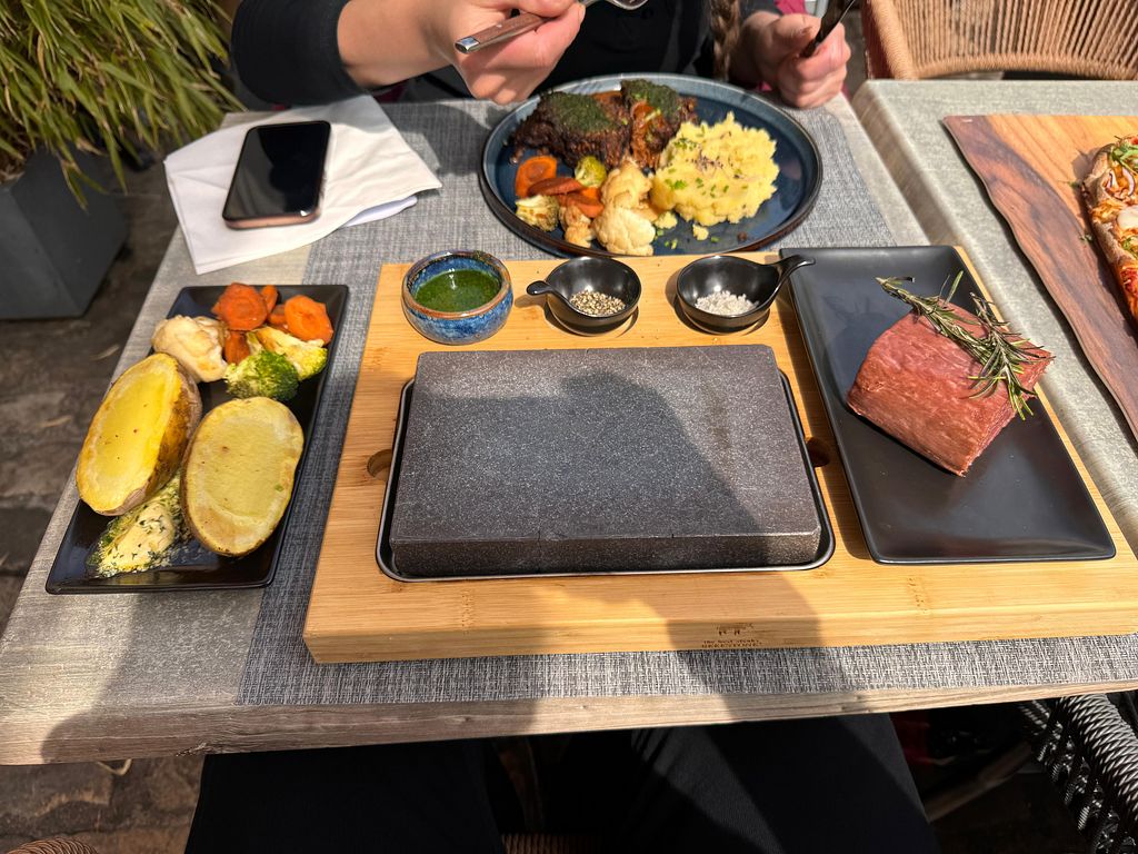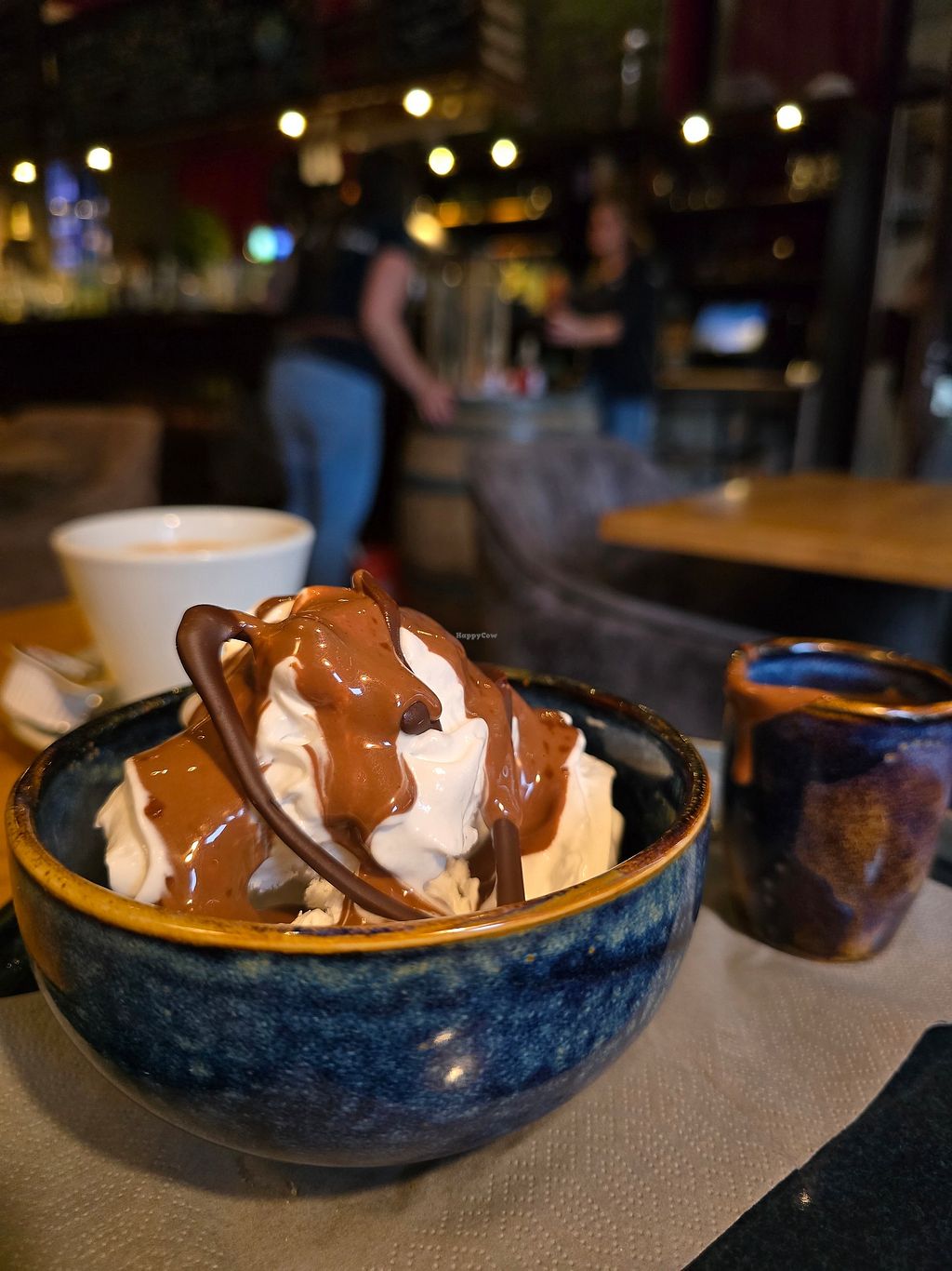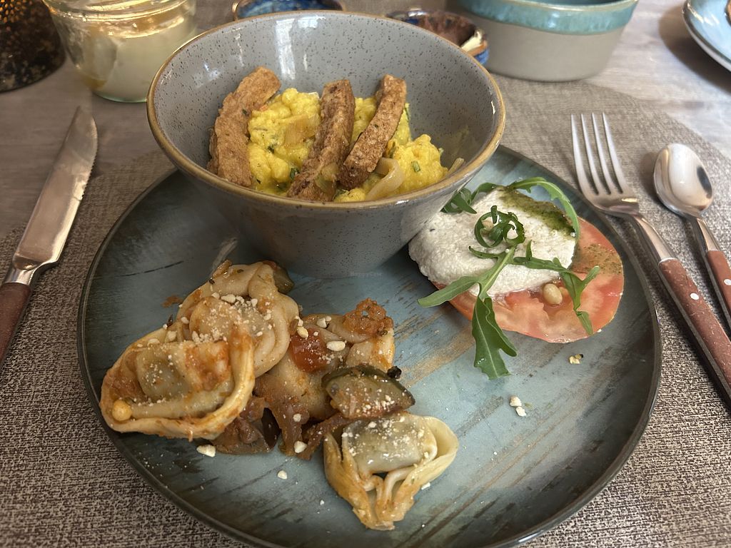 The food was nice. Great to have vegan cheezes, sauces, side dishes! Expensive though, but of course it is a tourist region ... The dessert is definitely a portion (and a price) to share.