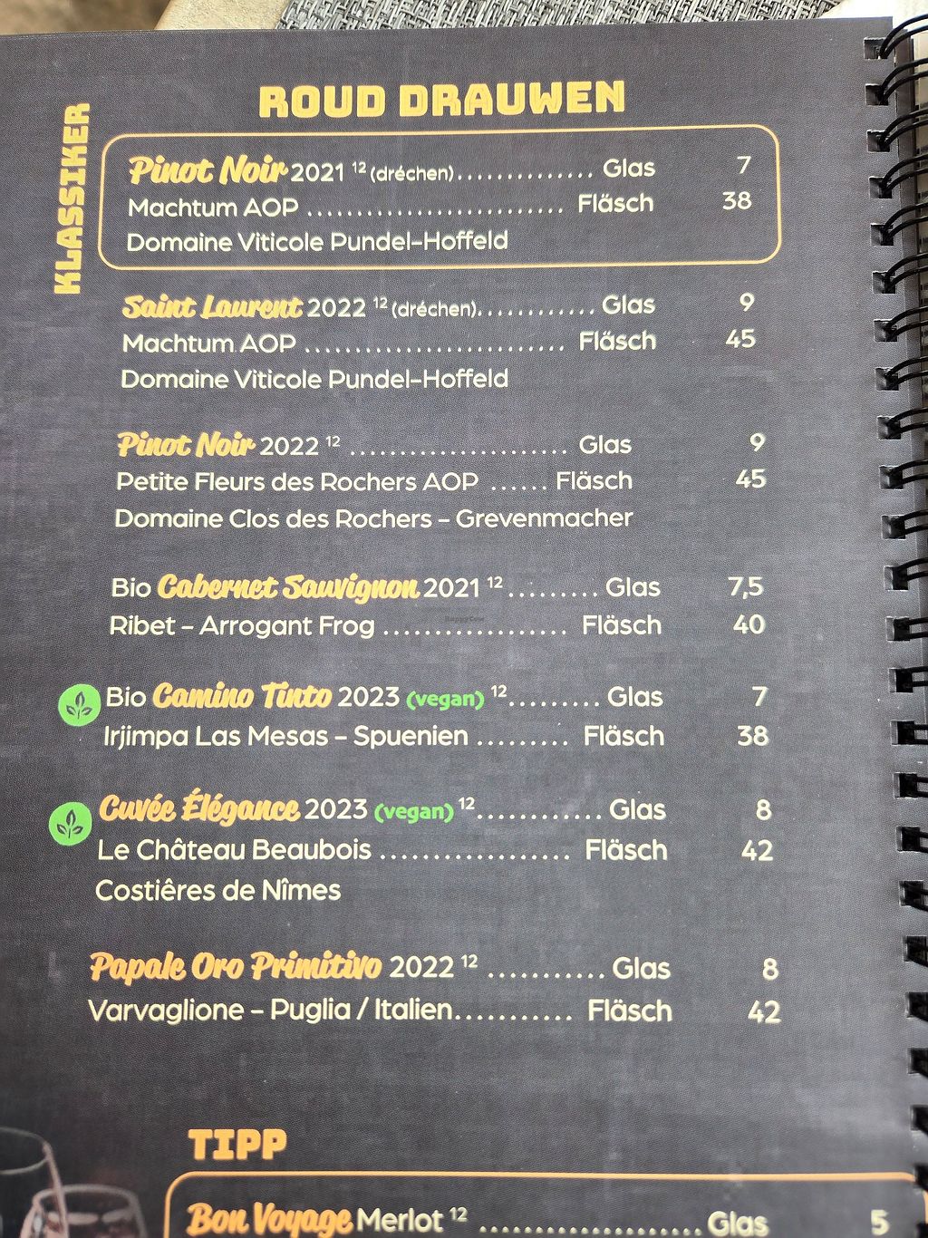 Serves meat, vegan options available. Brasserie-restaurant offering classic Luxembourgish dishes in addition to several vegan dishes like the pulled jackfruit burger, vegan-tuna salad on baguette, bruschetta with pumpkin and vegan parmesan, and a couple of pasta dishes. Uses local and regional produce. NOTE: Kitchen may break in the afternoon, check ahead. Open Mon-Sun 11:00-23:00. Closed Mon-Tue.
