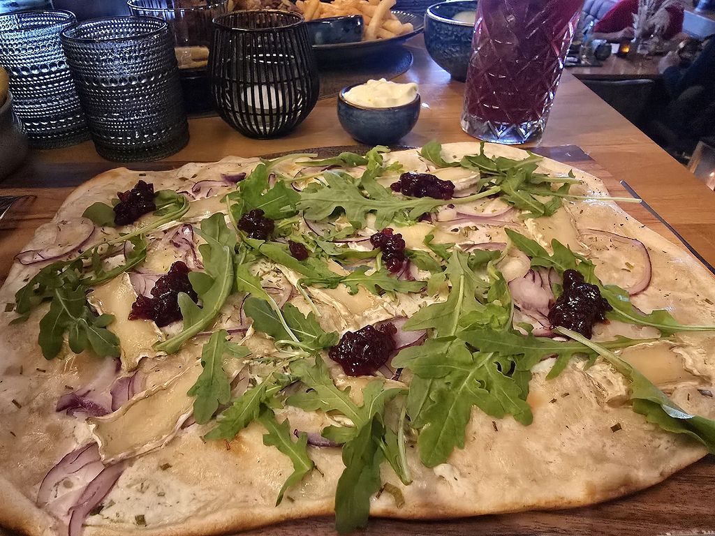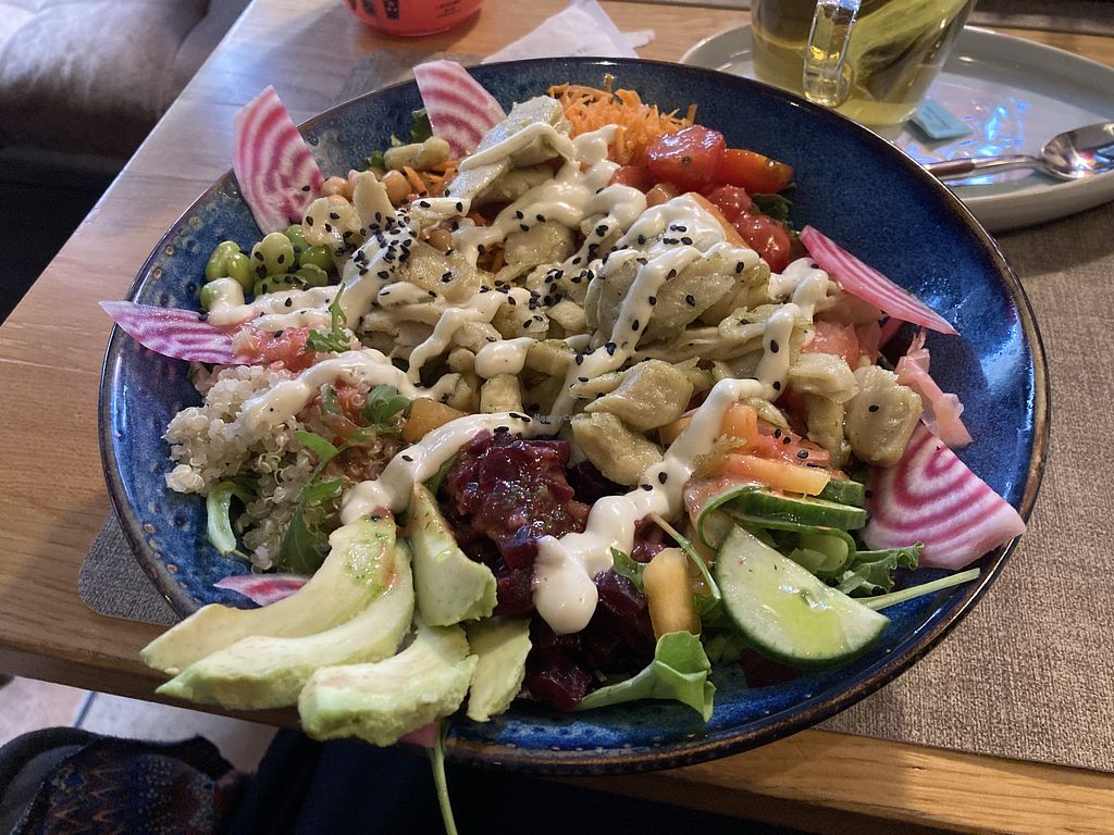 Wij namen een goedgevulde vegan pokebowl met quinoa en een flammkuchen met granaatappelpitjes cashewparmesaan, rucola en zoet geroosterde walnoten. Allebei heel lekker en er staan genoeg en duidelijk gelabelde keuzes op de kaart. Veggie of vegan. Er worden ook niet-veggie-vegan-gerechten gemaakt. Redelijk aan de prijs misschien , maar wij waren er wel blij mee. En je zit er gezellig. Glutenvrij ook mogelijk. Al weet ik niet hoeveel.