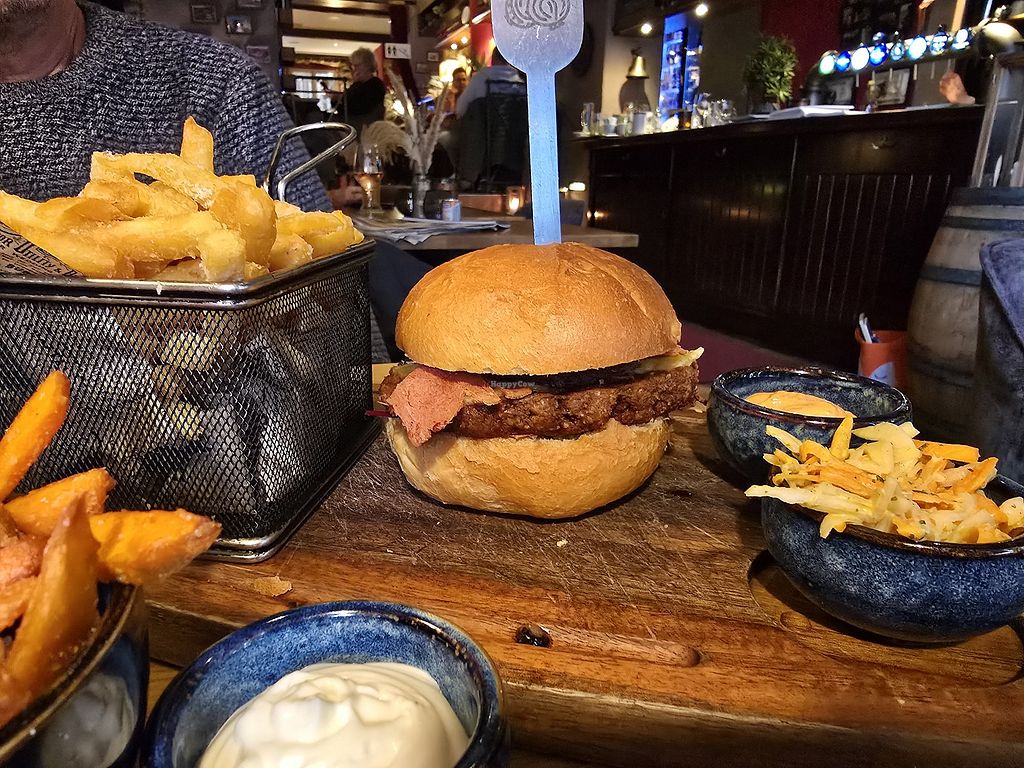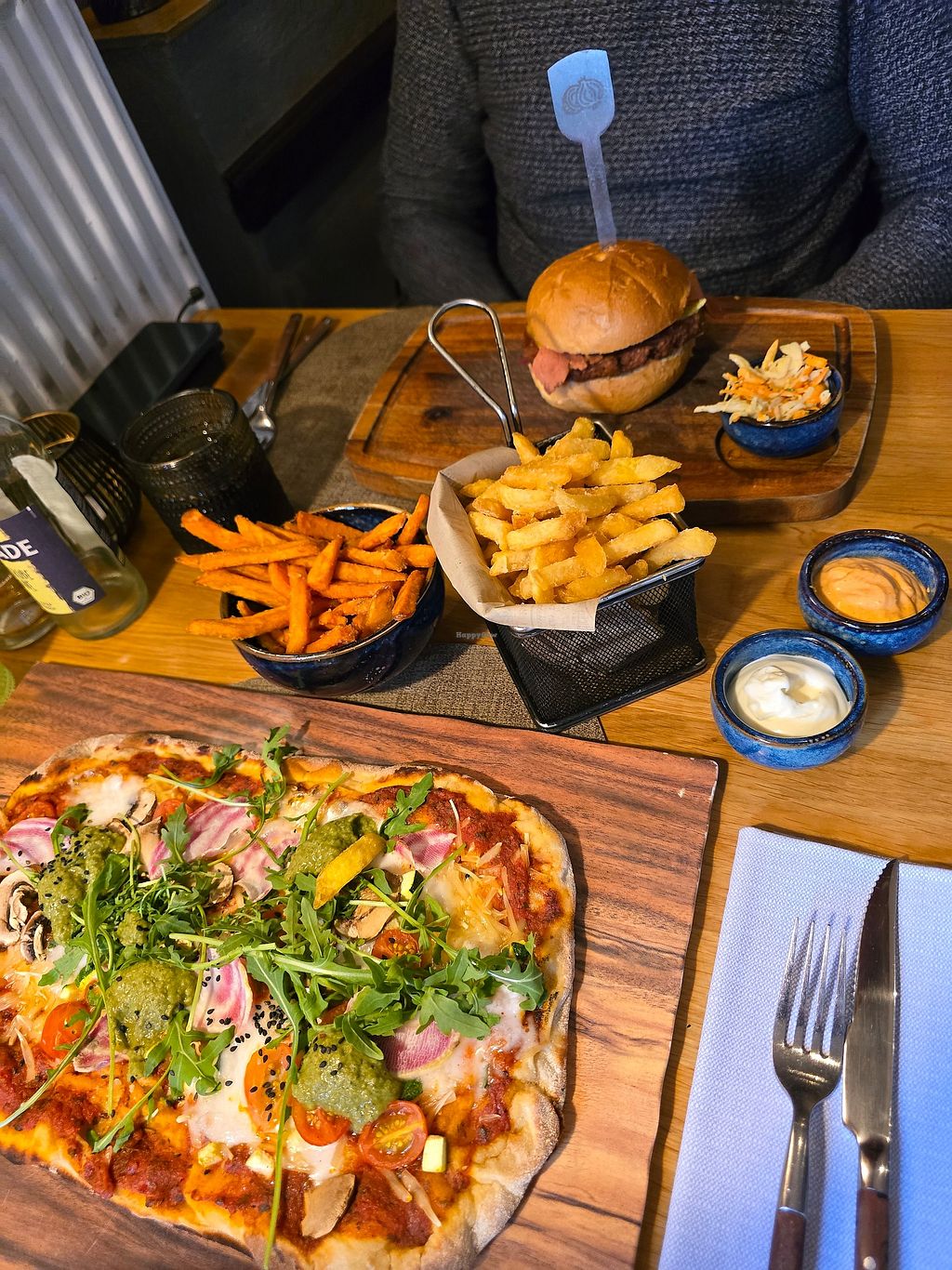 Truly amazing to have so many vegan options in a restaurant like this. Vegan options in every category, so not just fried food or pizza. Vegan options look designed from scratch, not just leave out some none vegan stuff. And for the burgers there are also vegan add ons like vegan cheeze/bacon. We had a burger and a Caesar bowl and loved both.