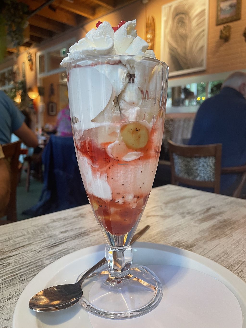 Nagerecht: Notencoupe; Vanilleroomijs met pecannoten, karamelsous en …