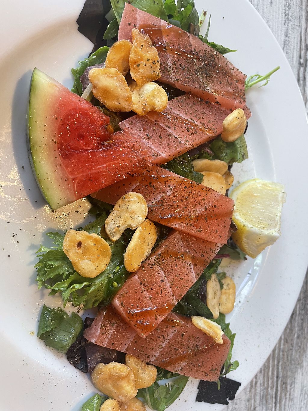 Vegan No Tuna Sashimi; “tonyn” op bladspinazie. gedroogde en gerookte …