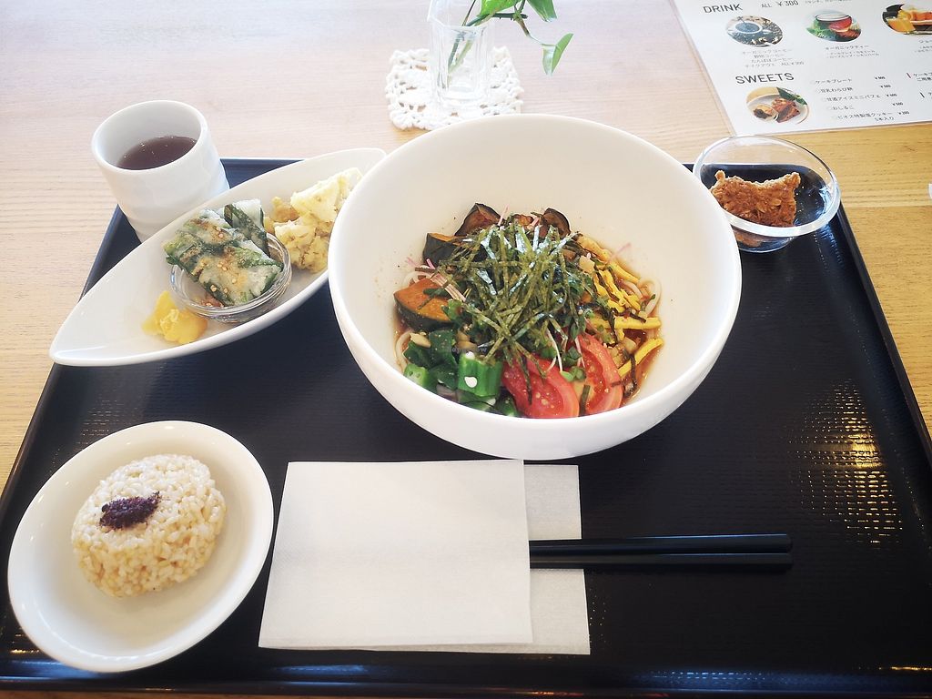 Second floor of what looks like an office / clinic building. Serves a daily lunch plate, daily rice ball plate, daily kids plate and daily dessert in addition to a wide selection of drinks. After a long day of taking my family around I told them we were eating at one of the two vegan spots in town and even though there was some griping the non vegans ended up LOVING the food. (I the vegan also did, of course.) Don’t skip the daily dessert plate, you get a variety of lightly sweet and incredibly tasty little Japanese sweets and cakes that are so good and go great with the complimentary barley tea. NB no parking but you can stop at the Family Mart lot across the street. Also easily walkable from the Tokushima Station area. Cash only.