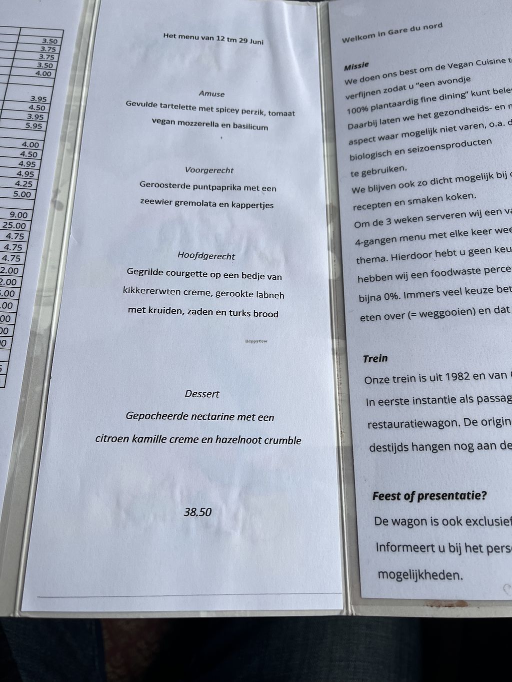 It is a complete vegan restaurant. Very good concept and atmosphere inside and outside the train wagon. The garden is very green and cozy. The train gives a nice dining experience. I really like the zero waste concept as well. They have a fixed menu including starter, main dish and dessert. The drinks are not included.
