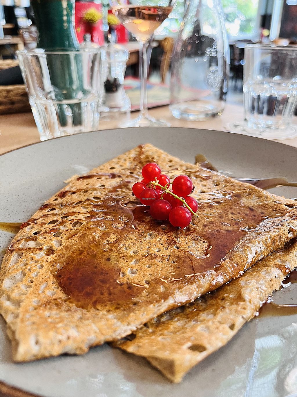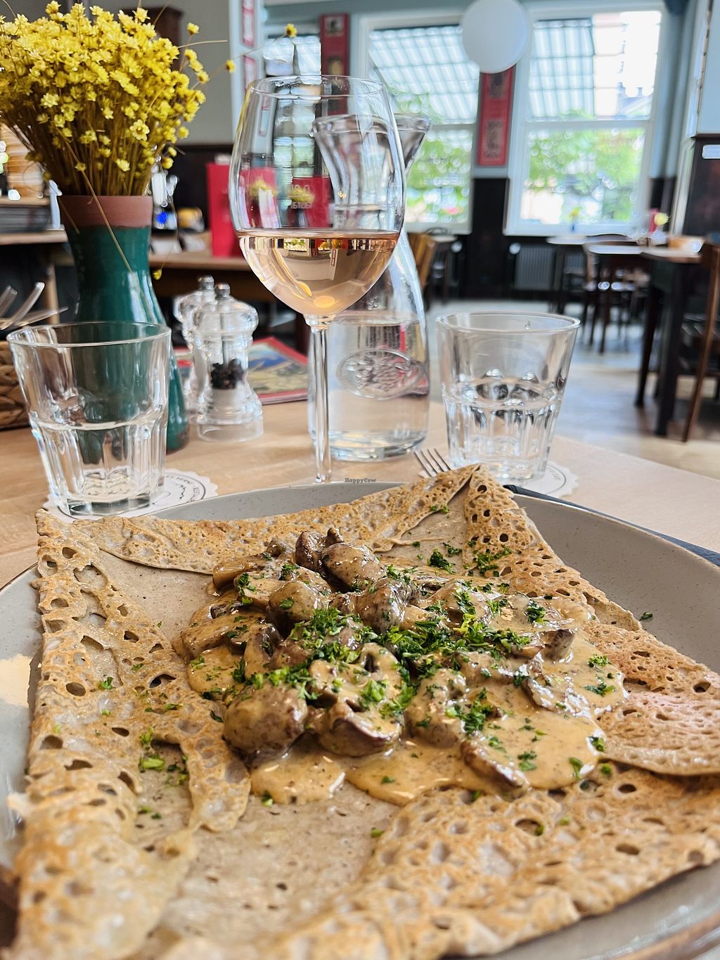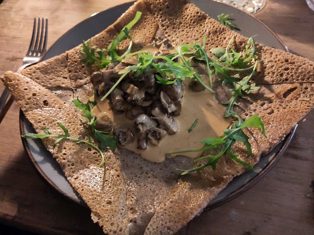 Serves meat, vegan options available. French restaurant with a separate vegan menu section. Choices include soups, salads, galettes with ratatouille or mushrooms, mushroom goulash with mashed potatoes, sweet galettes, and vegan vanilla ice cream. Confirmed to no longer offering vegan options October 2024.